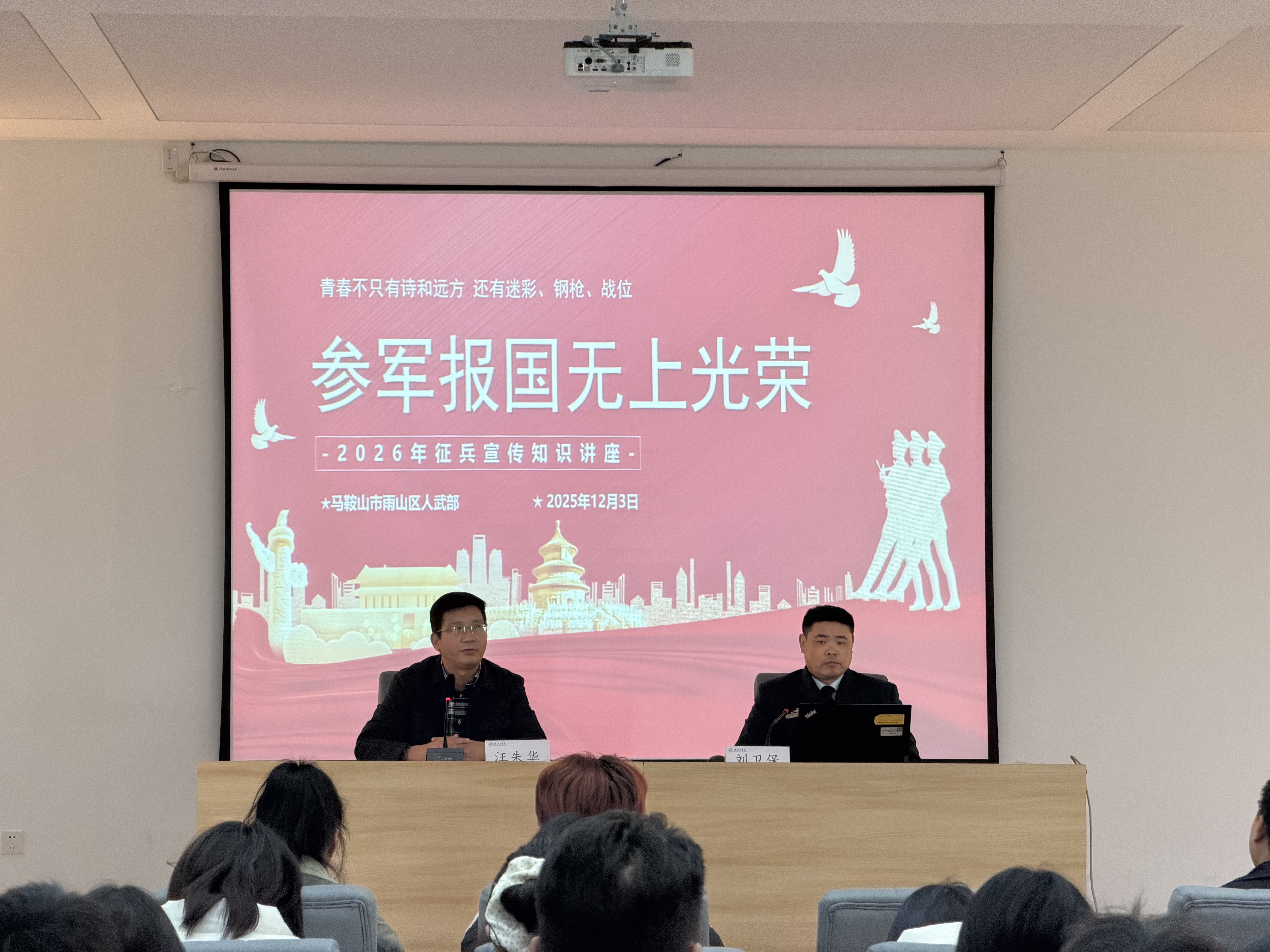 为深入贯彻落实国家征兵工作政策,进一步激发青年学子参军报国的责任感与使命感,引导优秀大学生投身国防建设,2025 年12月3日下午14:30,beat365正版唯一官方网站征兵政策宣讲会在水木楼西301教室正式举行。学生工作部常务副部长汪朱华、马鞍山市雨山区武装部科长刘卫保出席会议并作政策解读,各学院学生代表参加本次宣讲会。