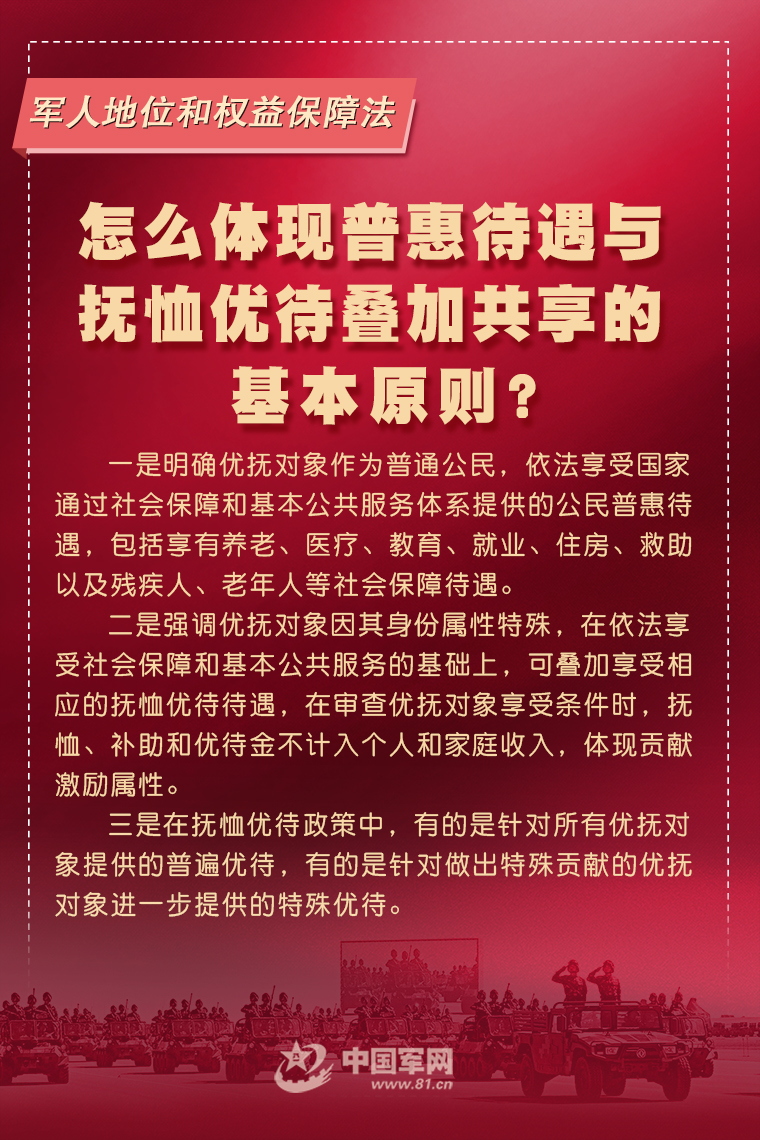 6月10日,十三届全国人大常委会第二十九次会议表决通过《中华人民共和国军人地位和权益保障法》,国家主席习近平签署第八十六号主席令予以公布,自2021年8月1日起施行。这是军人地位和权益保障的基础性、综合性法律,是深化国防和军队改革的重要成果。这部法围绕军人地位和权益保障的基本原则和基本制度作出了哪些规范?中国军网推出专家系列解读,阐释重要规定内涵和深层考量,快来一起看看吧。