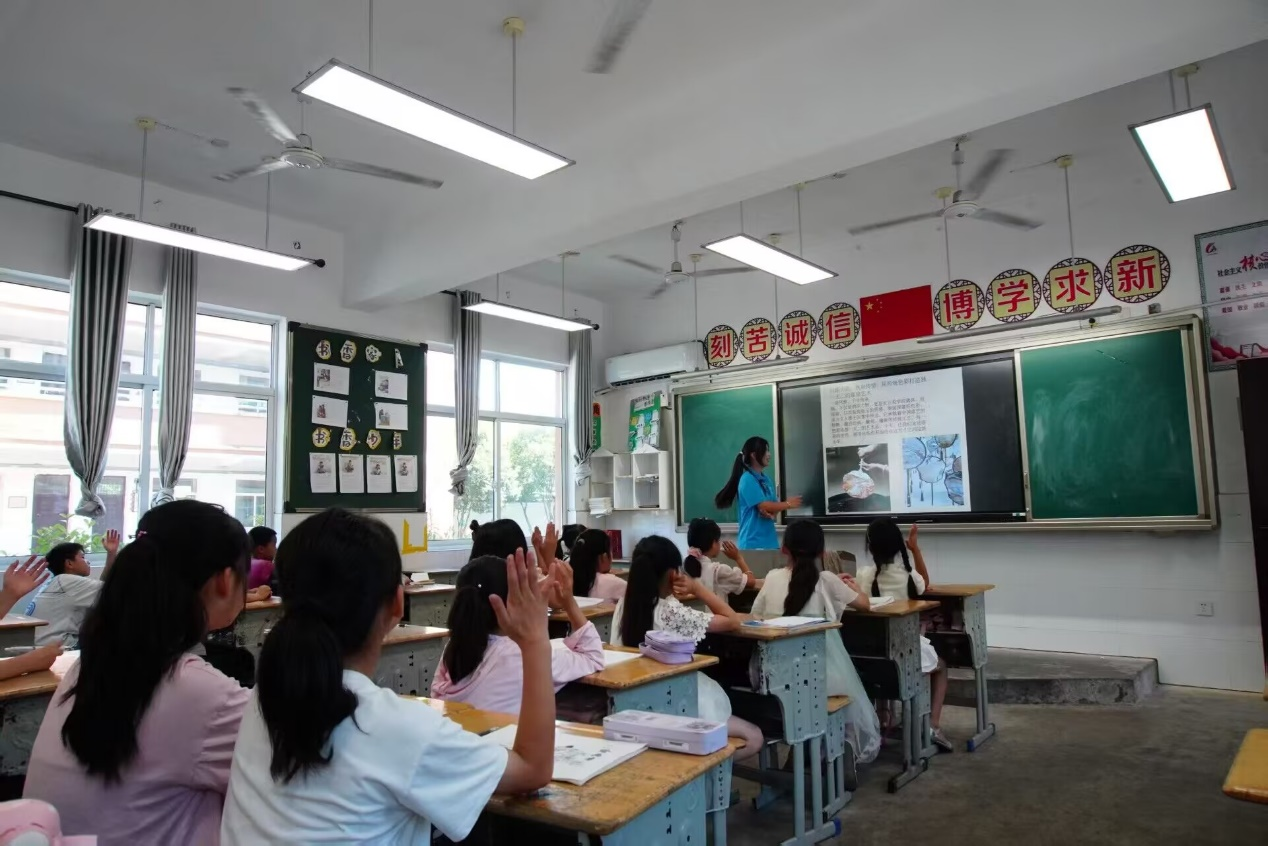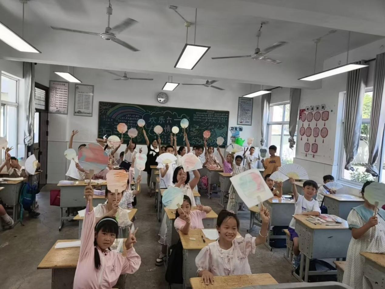 7月3日,实践团将阵地直接转向课堂,在四合中心小学开展“红色文化+非遗传承+普通话推广”主题课堂,将实践活动推向高潮。志愿者们用生动的语言讲解红色故事,用标准的普通话教孩子们描述纸扇图案,还设计了“汉字拼拼乐”以及“红色文化知识问答”等互动游戏。课堂上,孩子们积极参与,在欢乐中提升普通话能力,更埋下文化传承的种子。