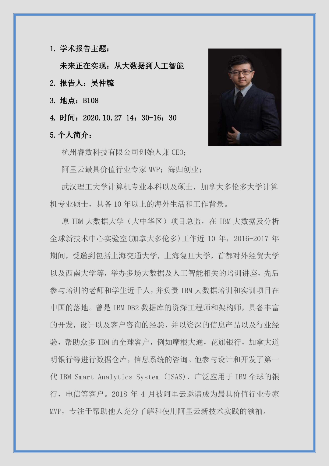 个人简介:杭州睿数科技有限公司创始人兼CE0;阿里云最具价值行业专家MVP;海归创业;武汉理工大学计算机专业本科以及硕士,加拿大多伦多大学计算机专业硕士,具备10年以上的海外生活和工作背景。原IBM大数据大学(大中华区)项目总监,在IBM大数据及分析全球新技术中心实验室(加拿大多伦多)工作近10年,2016-2017 年期间,受邀到包括上海交通大学,上海复旦大学,首都对外经贸大学以及西南大学等,举办多场大数据及人工智能相关的培训讲座,先后参与培训的老师和学生近千人,并负责IBM大数据培训和实训项目在中国的落地。