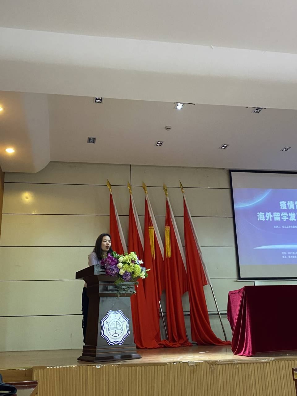 随后由现正在澳洲攻读金融硕士的16级优秀学生代表潘嫱同学,分享了她在澳大利亚纽卡斯尔大学的本科留学经历以及因为疫情在国内上网课的一些感想,并且和在座学生们讨论了留学可以给大家带来的改变和对未来工作的帮助。最后,学生代表们观看了由我院两位留学日本的同学所拍摄的视频,视频向大家真实地展现了疫情期间,海外学子的学习、生活状态。