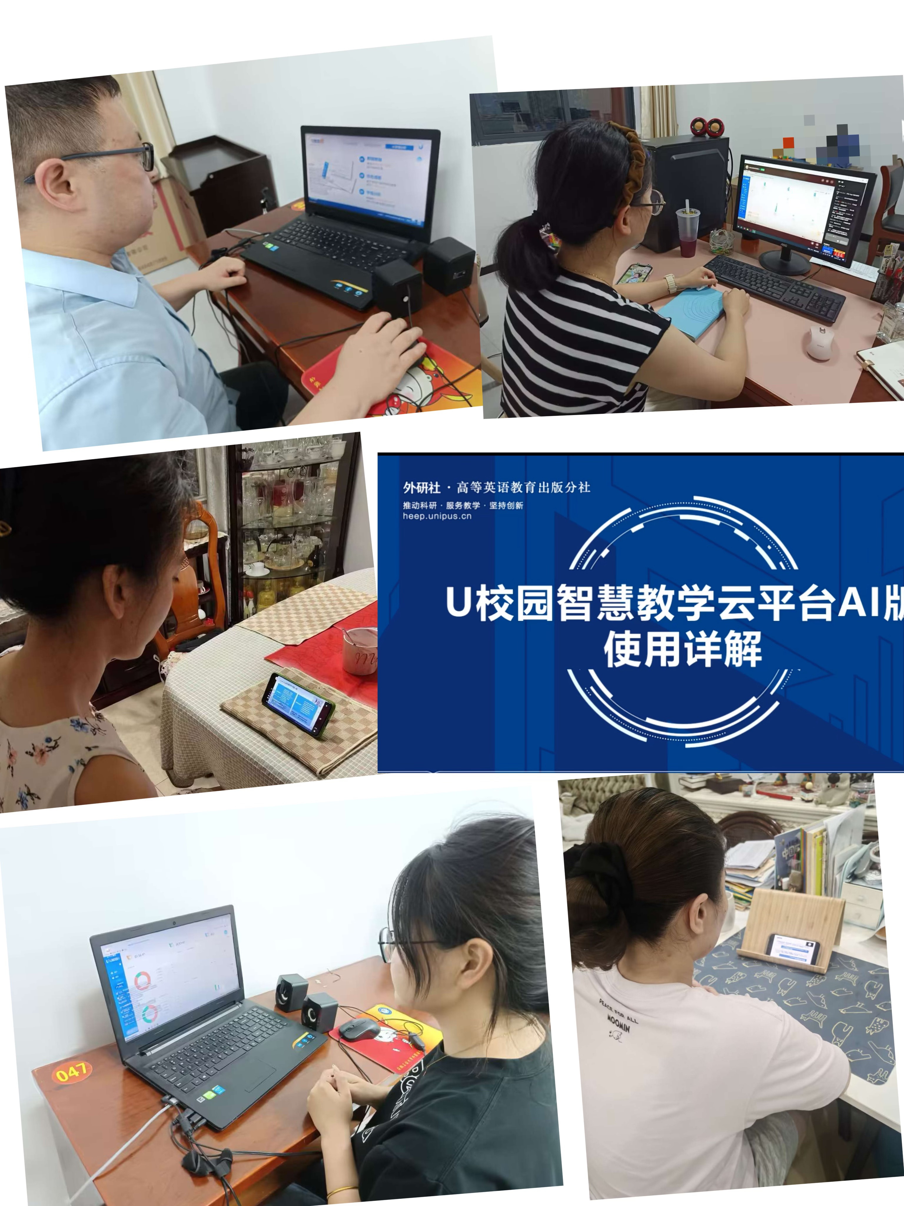 当天傍晚,教研室全体教师参加外语教学与研究出版社组织的“U校园智慧云平台AI版功能详解”云端研修,出版社老师在线展示智慧平台AI版功能、使用步骤、互动优势等,通过学习, 教师们进一步了解了人工智能嵌入外语教育以及发挥的巨大辅助作用。教研室将在暑期组织老师们继续系列研修,力争在下半年教学中能适当利用人工智能优势,让学生更乐于学习,教学也能取得更好的效果。