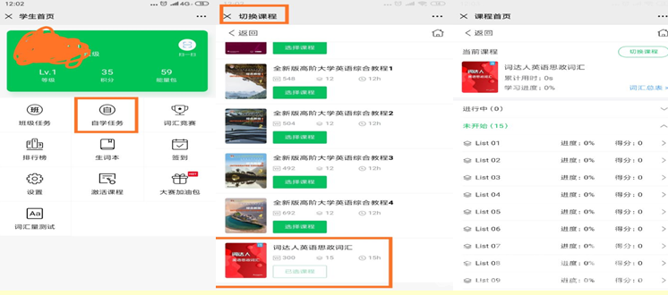 2. 本届大赛涉及的课程思政相关词汇可通过“词达人”——“学生端”——“自学任务”中的《词达人英语思政词汇》课程进行免费学习。具体参考以下几幅图片