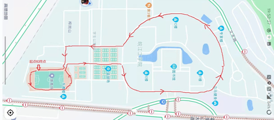 霍里山校区田径场计时台出发绕场地都从田径场门口出→篮球场中间跑到→校环形道→校东门→学校专家楼→教学楼C楼后侧→篮球场西侧道路(靠近宿舍区)→排球场西侧→田径场门口→霍里山田径场计时台。