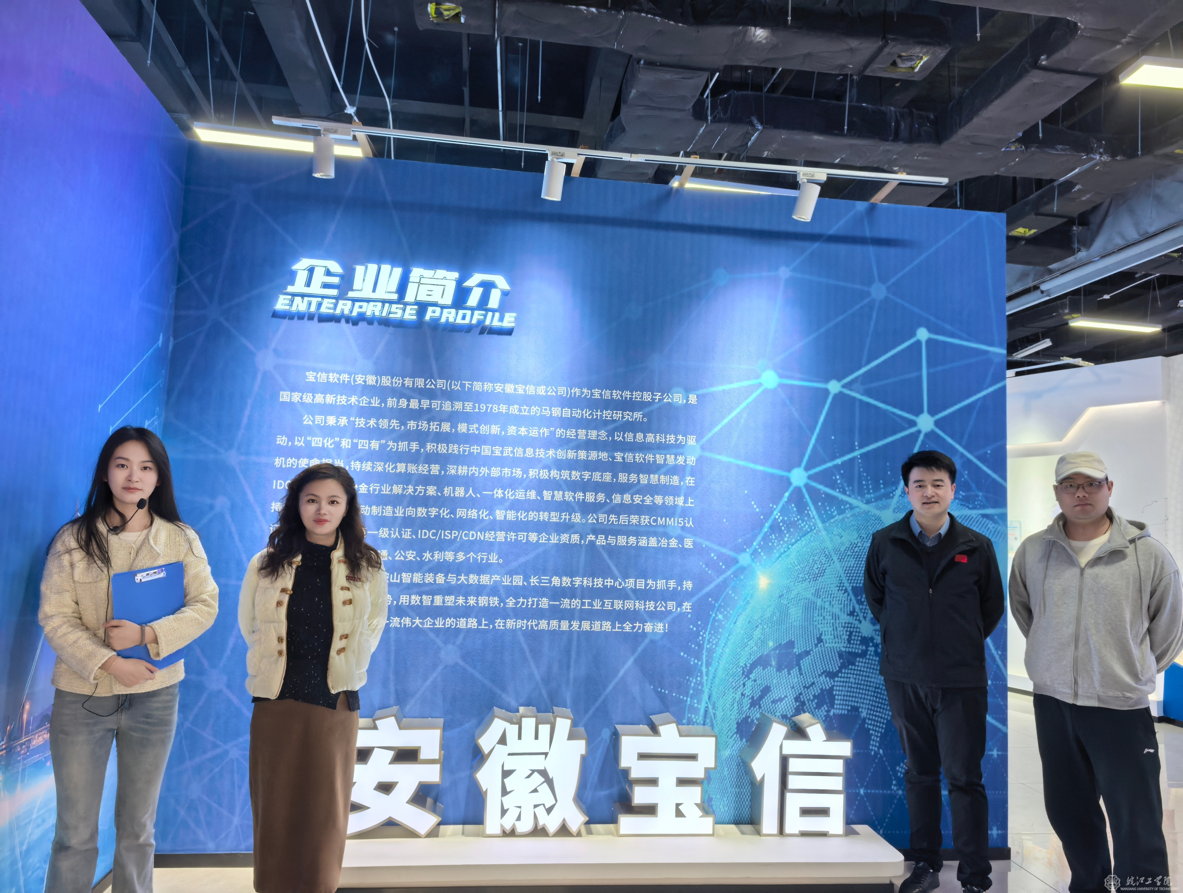 在安徽宝信软件展厅,邓宇老师充分发挥“专业+外语”双重优势,围绕公司简介、核心技术能力、工匠基地建设及机器人展示等核心内容进行双语讲解。讲解过程中,邓宇老师精准提炼中文核心专业短语的英文表达,通过提问互动、现场纠错等方式引导学生积极参与,有效激发了学生的学习积极性。学生们认真聆听讲解,针对专业术语等双语转换要点主动发问,现场学习氛围浓厚,互动效果良好。