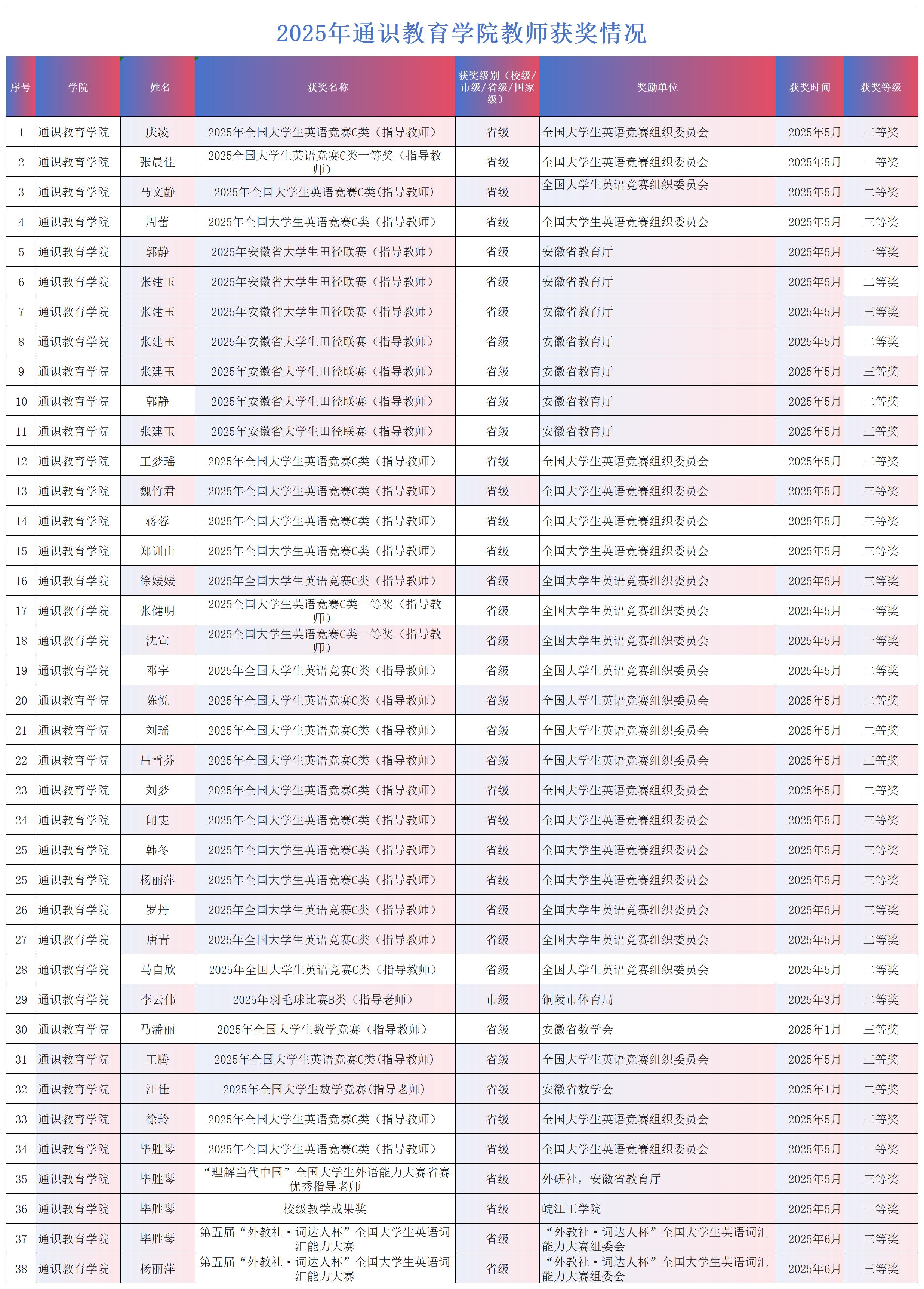 通识教育学院领导创新管理,充分发挥教研室的作用,为教师发展创造各种有利条件,近年来,通识教育学院教师共成功立项各类省级课题30余项,荣获各类省级荣誉称号10余项,其中1位教师光荣当选省党代会代表,1位教师被评为安徽省“最美军嫂”,数位教师先后被评为“安徽省模范教师”、“安徽省优秀教师”、“安徽省教坛新秀”。通识教育学院教师指导学生参加各类学科竞赛,累计获得各种奖励共200余项,其中国家级奖项10余项, 省级奖项251项(不含省级优秀奖)。