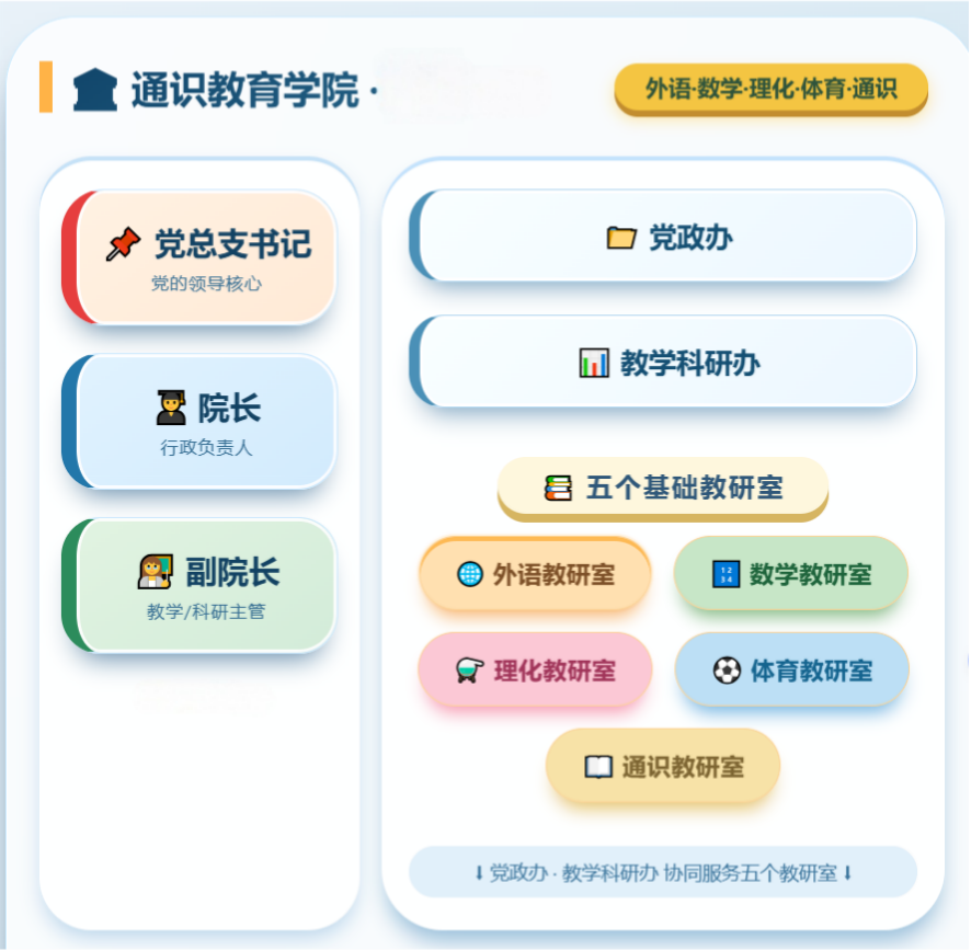 通识教育学院(原基础教学部)是校直属教学科研单位,成立于2008年9月,更名于2024年7月,下设数学、理化、外语、体育和通识五个教研室,拥有物理、化学两大类实验室。学院秉承“强基固本,启智健身,博学多思,修德砺能”的理念,承担全校大学数学、大学物理、大学化学、大学英语、大学体育及物理实验、化学实验等公共基础课程的教学任务。