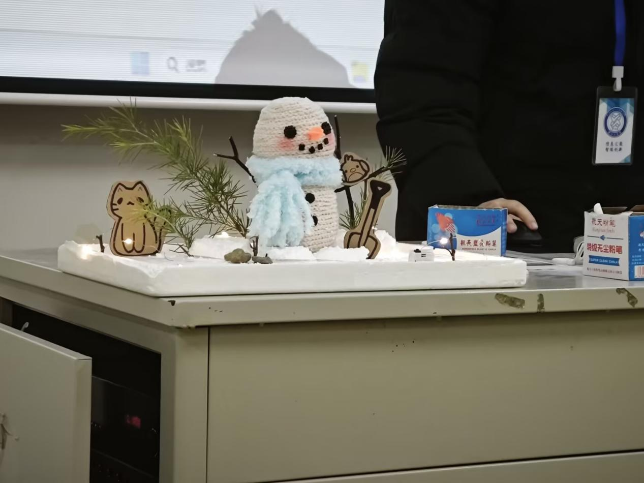 随后,B类6组参赛队伍依次进行展示答辩。“超从容应对”“东方不buy队”“小雪人”等队伍依次登台,呈现了由废旧材料精心创作的多元作品:有的将芬达瓶、旧毛巾组合成“再生之光”雪人装置,传递环保新生理念;有的运用纸板、泡沫构建兼具实用与美感的建筑模型。每件作品都承载着同学们对绿色生活的独特理解与热忱表达。经评审,2025级信息管理与信息系统5班杨靖坤同学带领的队伍脱颖而出,荣获一等奖。