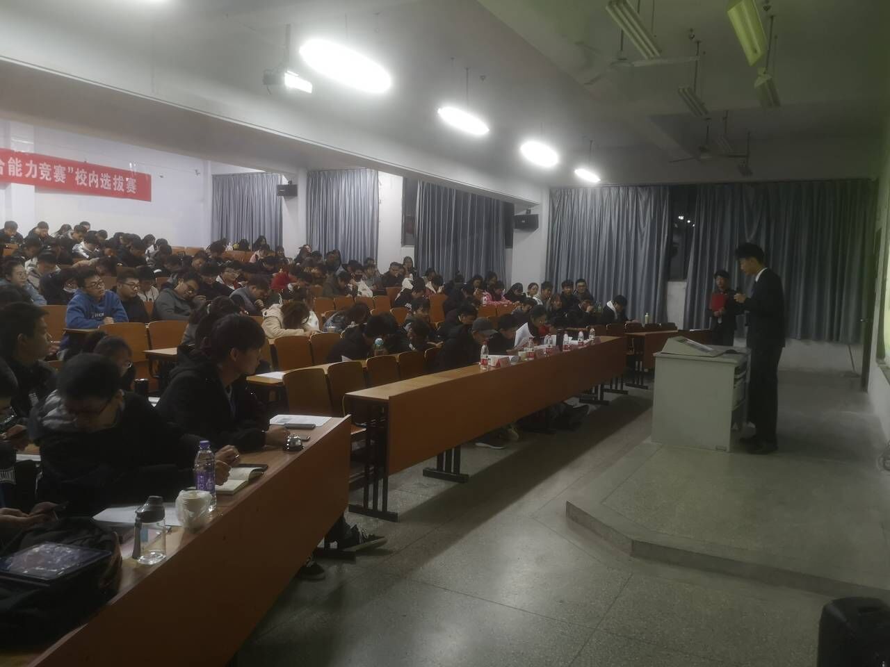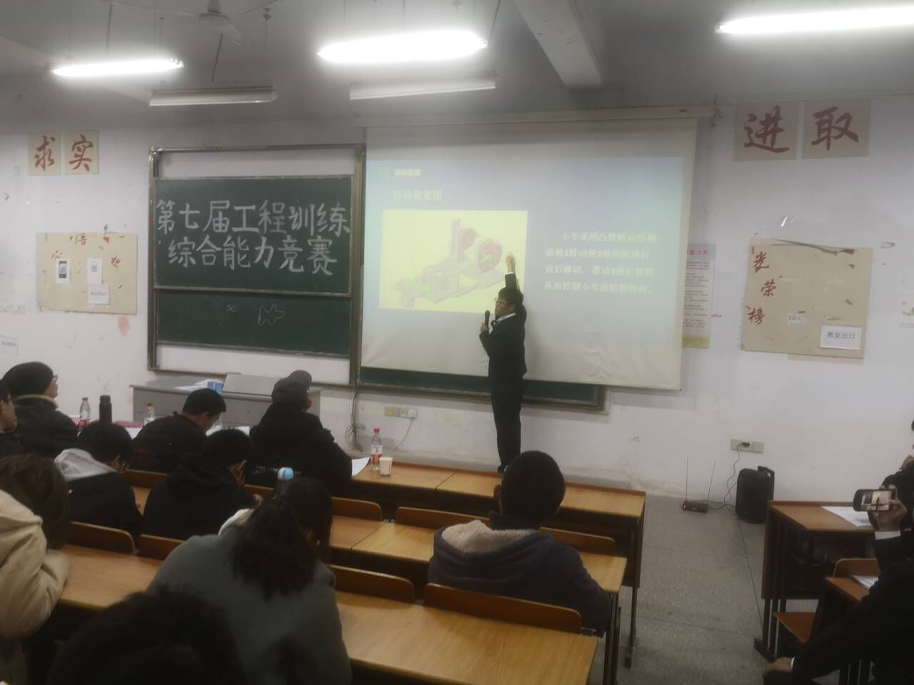 比赛当天,科协工作人员提前到达B208教室布置现场并对设备进行检查,布置好一切后安排老区选手、观众按顺序入座,比赛在新区选手及观众到达现场后正式开始。首先由主持人介绍到场的五位评委老师并宣读比赛规则,随后新区选手依次上台介绍作品并对老师的提问进行答辩,紧接着是老区选手上台为大家介绍作品并答辩。19:30分,比赛中场休息,新区选手及观众在工作人员的带领下依次有序撤离比赛现场,乘坐校车返回郑蒲港校区。20:00所有选手答辩完毕,主持人宣布第七届全国大学生工程训练大赛beat365正版唯一官方网站校内选拔赛圆满结束!