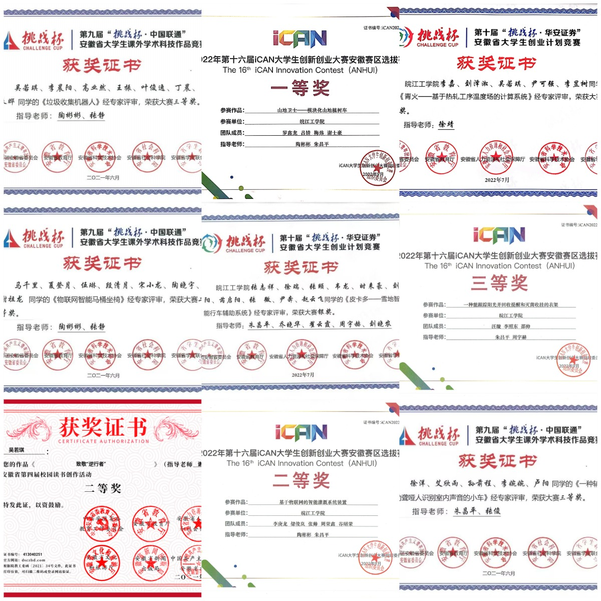 学院积极鼓励学生参加各类学科竞赛,丰富课外活动,提高学生的创新能力,吸收具有创新能力的学生从事实践活动。学院优秀学子在APMCM亚太地区大学生数学建模竞赛、美国大学生数学建模竞赛、数学中国数学建模国际赛、全国信息技术应用水平大赛、全国大学生机械创新设计大赛、全国大学生先进成图技术与产品信息建模创新大赛、中国计算机设计大赛、Robocup公开赛、安徽省“挑战杯”竞赛、飞思卡尔智能车大赛、大学生工程训练综合能力竞赛及安徽省大学生工程训练综合能力竞赛等高级别学科竞赛中均取得优异成绩。累计获得国际赛事奖项20余项、国家级比赛100余项。