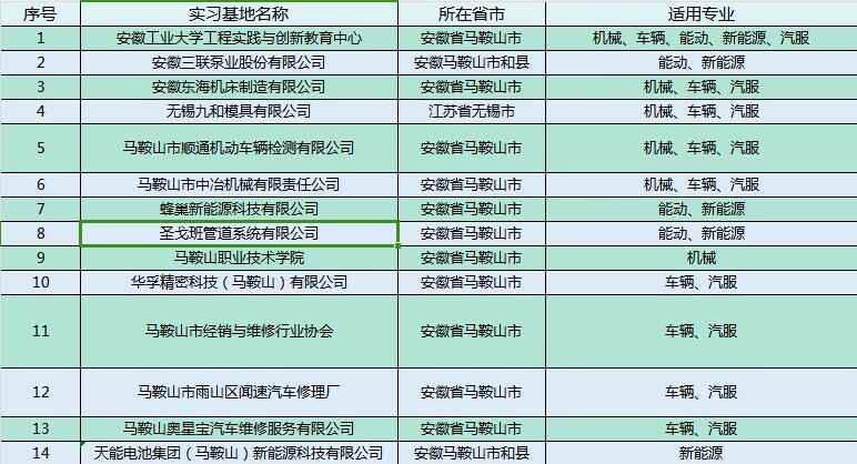 实习基地:华孚精密科技(马鞍山)有限公司、安徽工业大学实践与创新教育中心、安徽三联泵业股份有限公司、安徽东海机床制造有限公司、无锡九和模具有限公司、马鞍山市顺通机动车辆检测有限公司、马鞍山市中冶机械有限责任公司、马鞍山奥星宝汽车维修服务有限公司等。