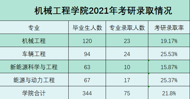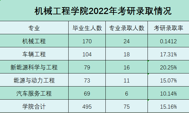 机械工程学院专业设置和人才培养方案符合国家经济及社会发展需求,自办学以来,已有多名学生考上研究生,历年考研率均超过15%,其中部分学生被武汉大学、中国石油大学(北京)、河海大学、合肥工业大学等名校录取。机械工程学院历年毕业生就业率均在95%以上。