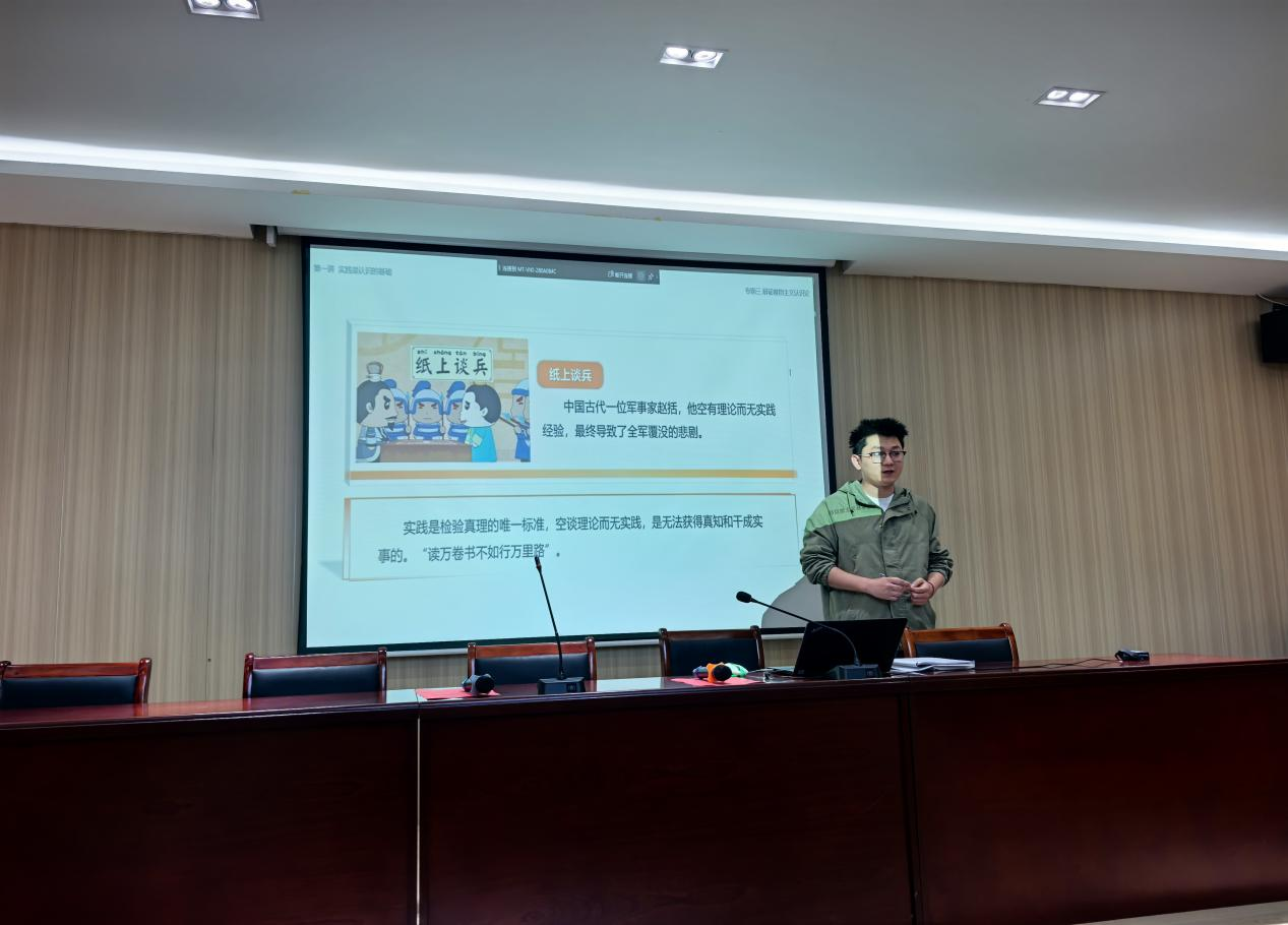 本次备课会的主讲人是常嵩老师,主讲内容为“科学的实践观及其意义”。为帮助学生在历史与现实的双重维度中把握这一抽象理论,常老师精心设计了课程导入环节。他以“纸上谈兵”的经典典故为引,通过赵括熟读兵书却因缺乏实战经验而导致长平之战惨败的史实,生动揭示了脱离实践的认知局限与危害。这一导入既贴近学生认知水平,又巧妙勾连起理论与现实的张力,引发在场教师的广泛共鸣。