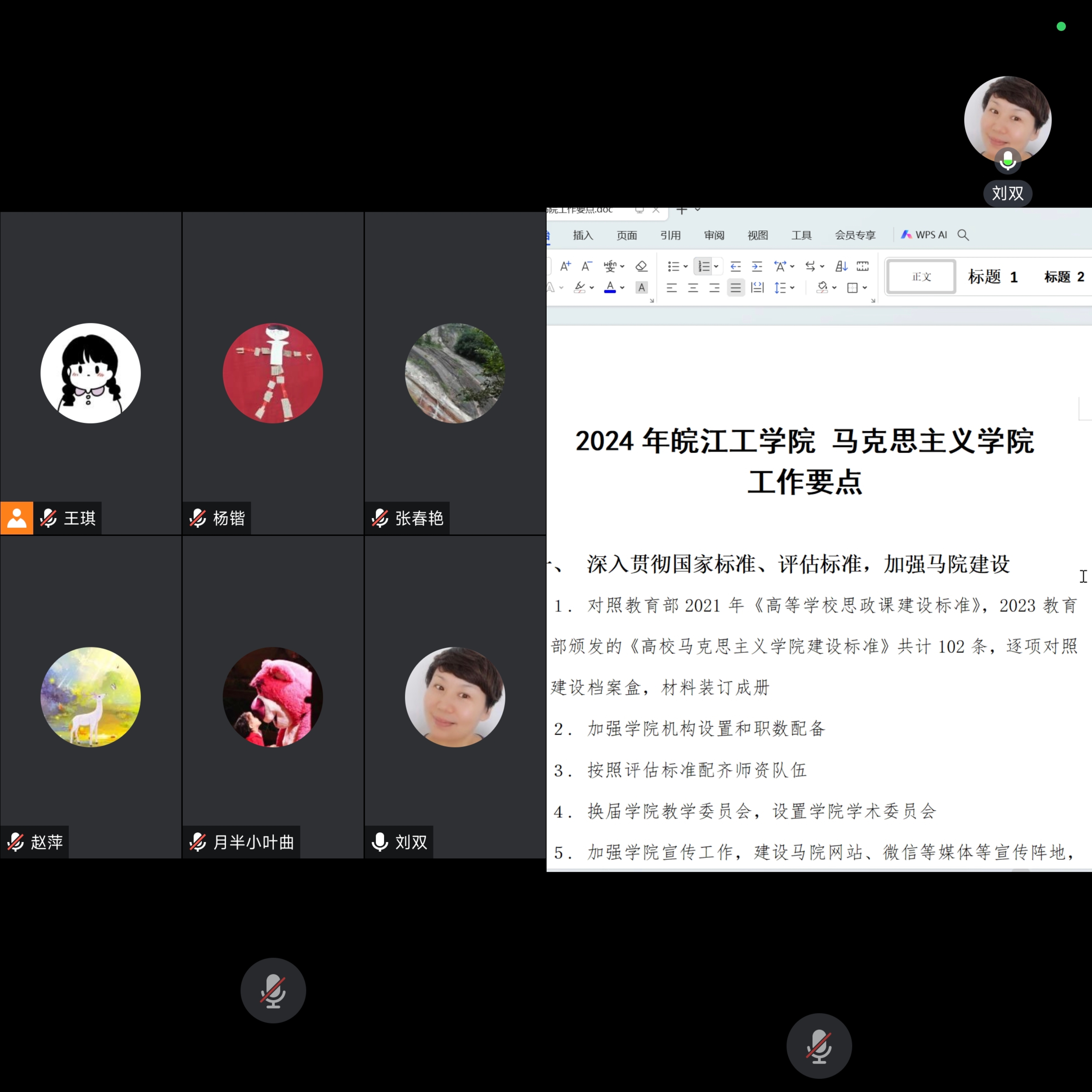 为确保新学期学院教学管理工作平稳运行、教学环境风清气正。1月21日晚上,马克思主义学院在腾讯会议召开线上2024年重点工作研讨会,研讨谋划2024年学院重点工作。马克思主义学院常务副院长、党总支书记刘双、院长助理张春艳、各教研室主任、行政办、教学办参加,会议由刘双主持。