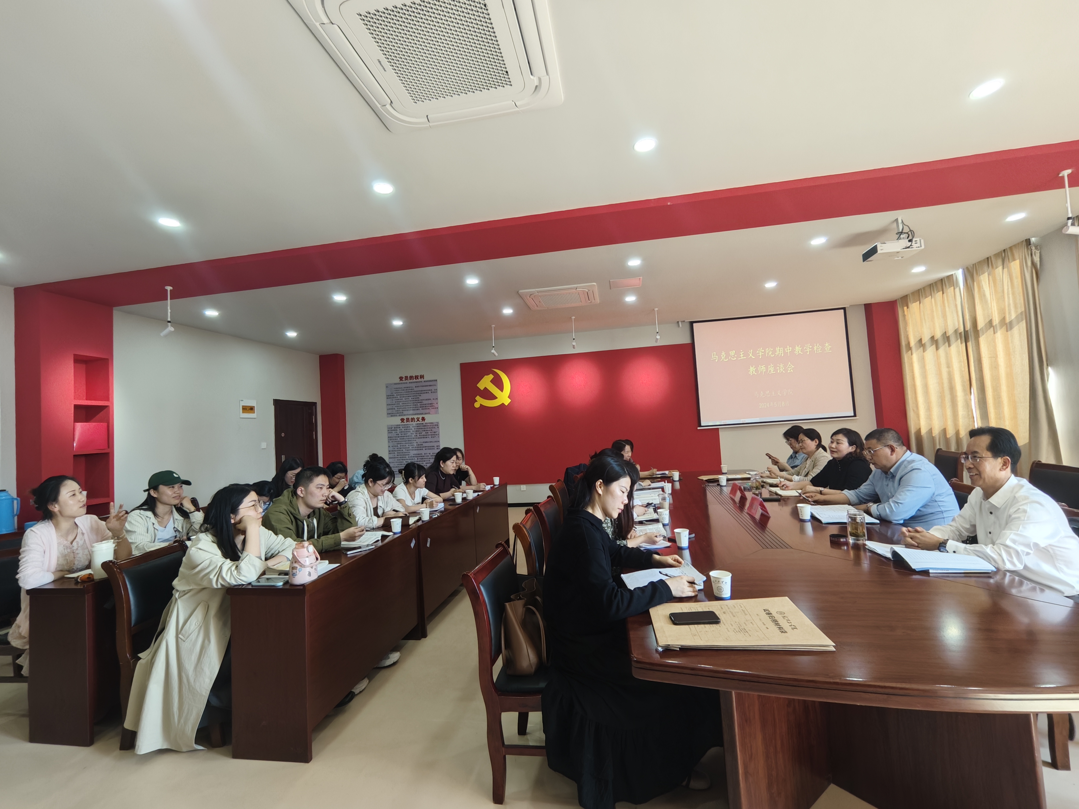 为深入了解思政课教学运行情况,扎实推进期中教学检查工作。5月8日,马克思主义学院在党员活动室组织召开期中教学检查教师、学生座谈会,院督导专家单连春,常务副院长、党总支书记刘双,教研室主任、马院全体教师及学生代表参加。会议由刘双主持。