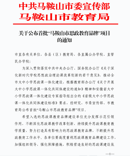 2025年5月13日,中共马鞍山市委宣传部、马鞍山市教育局下发了《关于公布首批“马鞍山市思政教育品牌”项目的通知》文件,beat365思政课“劳模上思政第一课”荣获首批“马鞍山市思政教育品牌”项目。