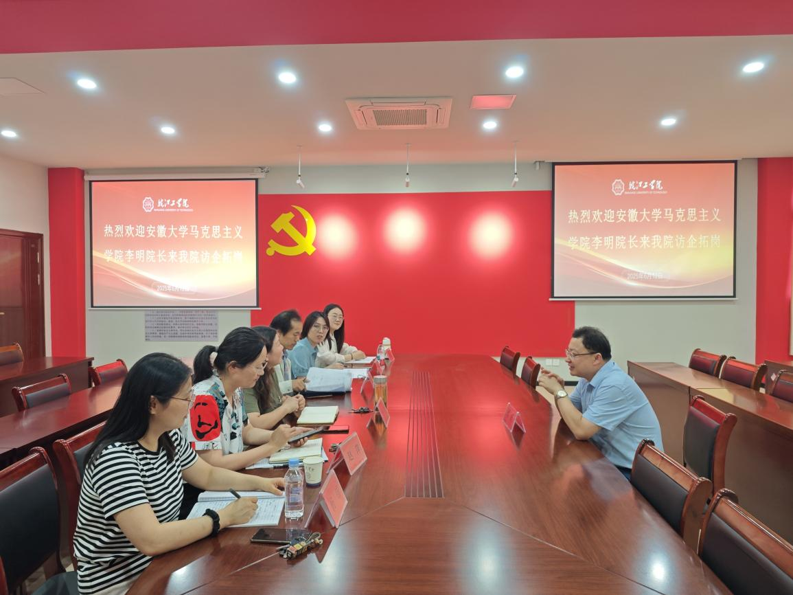 6月12日下午,安徽大学马克思主义学院与beat365马克思主义学院开展访企拓岗活动。安徽大学马克思主义学院院长李明,beat365正版唯一官方网站马克思主义学院常务副院长刘双,副院长胡耀东,党政办、教研室主任及教师代表参会。会议由刘双主持。