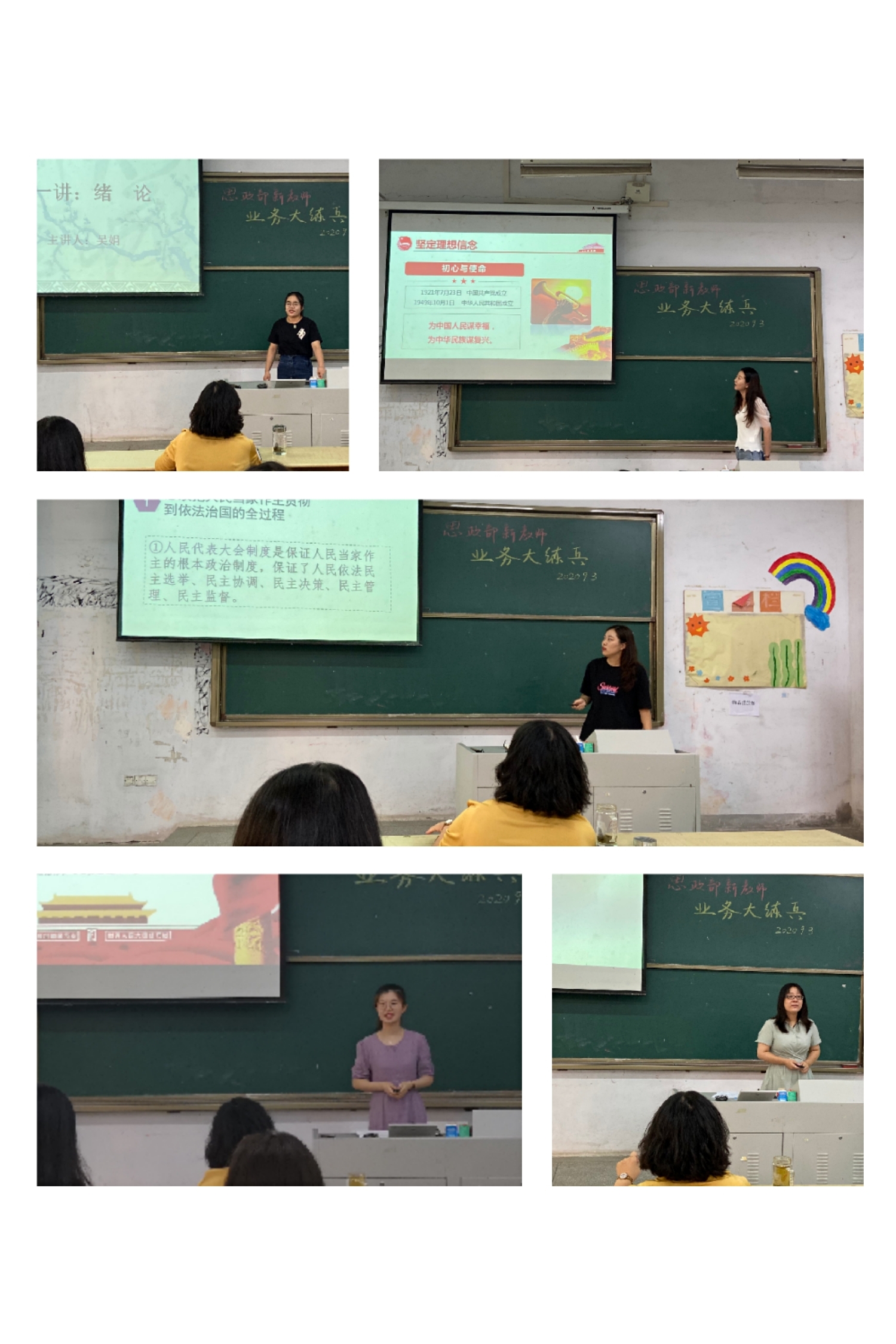 9月3日上午9:00,在霍里山校区B106教室,思政部组织本学期新教师讲课“业务大练兵”活动,思政部常务副主任刘双,专职教师兼行政秘书闫晶,概论组组长张春艳,及新教师王玉珏、翟云霞、吴娟、王剑叶、何源等参加此次大练兵活动。活动由刘双主持。
