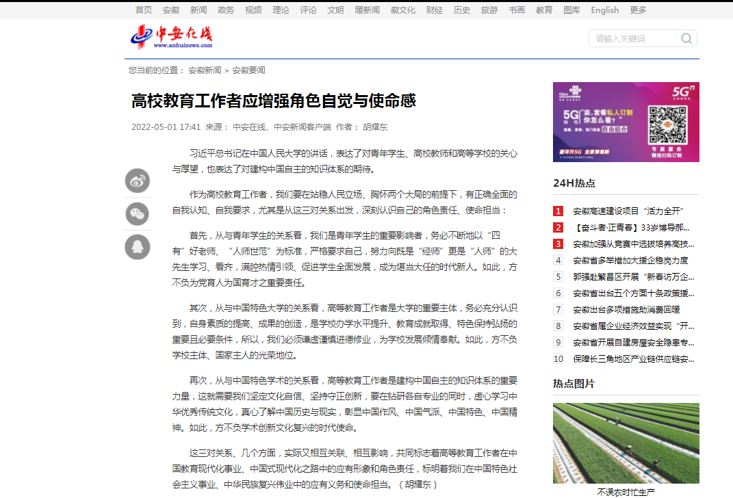 为深入学习贯彻习近平总书记在中国人民大学考察时重要讲话精神,近日,beat365副教授胡耀东代表马克思主义学院在学校学习会上发表言论,并以第一作者身份在《中安在线》媒体发表题为《高校教育工作者应增强角色自觉与使命感》的评论员文章,指引我们作为高校教育工作者,要在站稳人民立场、胸怀两个大局的前提下,有正确全面的自我认知、自我要求,应增强角色自觉与使命感。全文如下: