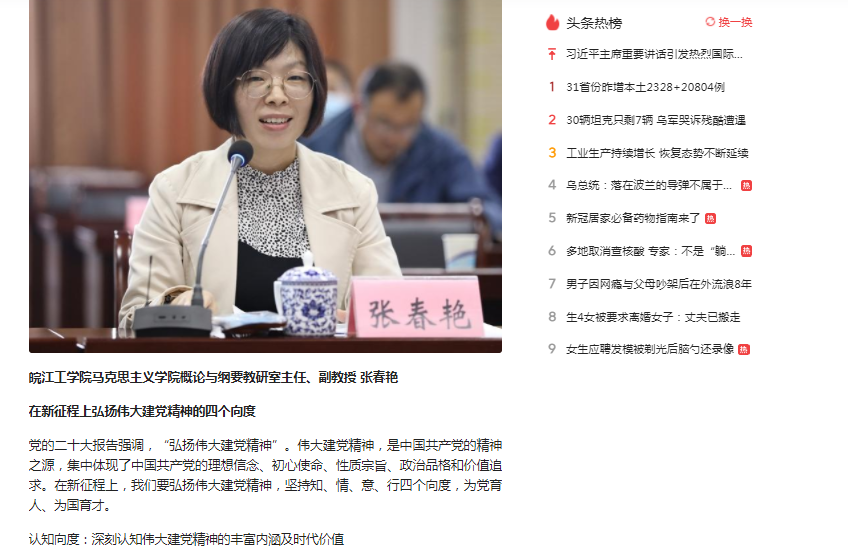 张春艳围绕《新征程上弘扬伟大建党精神的四个向度》发言交流。她强调,党的二十大报告中提到的伟大建党精神,是中国共产党的精神之源,集中体现了中国共产党的理想信念、初心使命、性质宗旨、政治品格和价值追求。在新征程上,我们要弘扬伟大建党精神,坚持知、情、意、行四个向度,深刻认知伟大建党精神的丰富内涵及时代价值,激发投身全面建设社会主义现代化国家的真挚情怀,锻造投身全面建设社会主义现代化国家的坚强意志,凝聚伟大建党精神领航新征程的实践伟力,做到为党育人、为国育才。(编辑:王琪 审核:刘双)