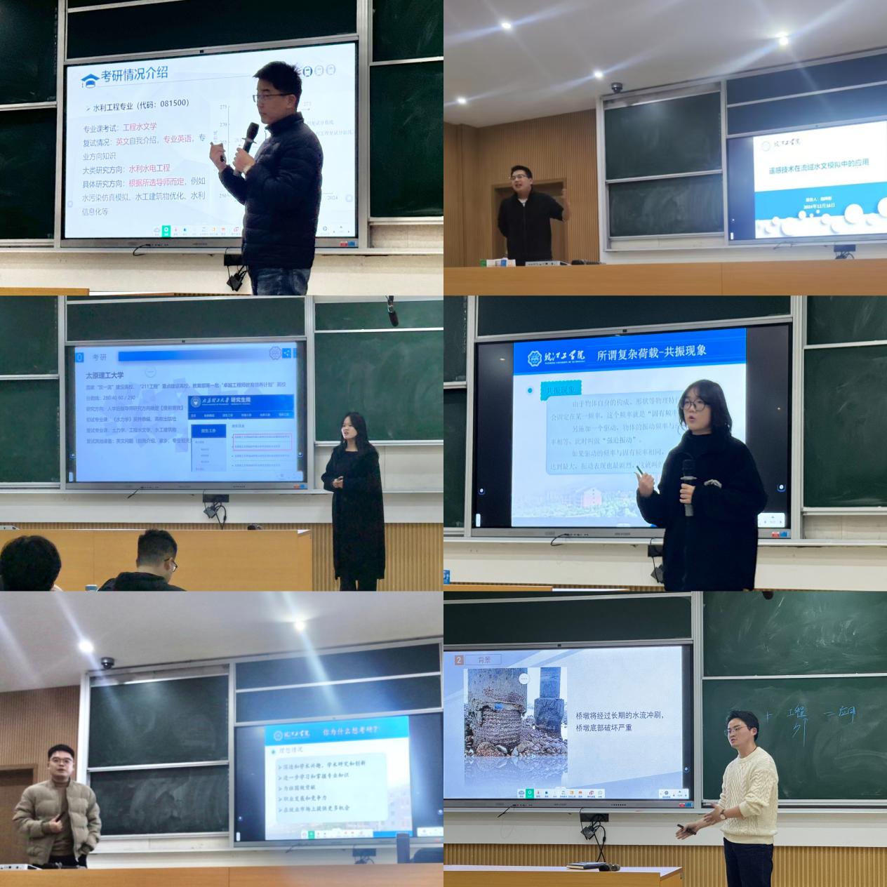 在互动交流环节,为了引导水工专业学生做好学业规划,提高考研的报名率,主讲教师们分析了当前的社会大环境之下严峻的就业形势,并分享了自己研究生就读院校的招生简章、初复试专业课科目及往年的录取分线等信息。彰显了学院追求高质量就业的目标,扎扎实实为学生发展服务。