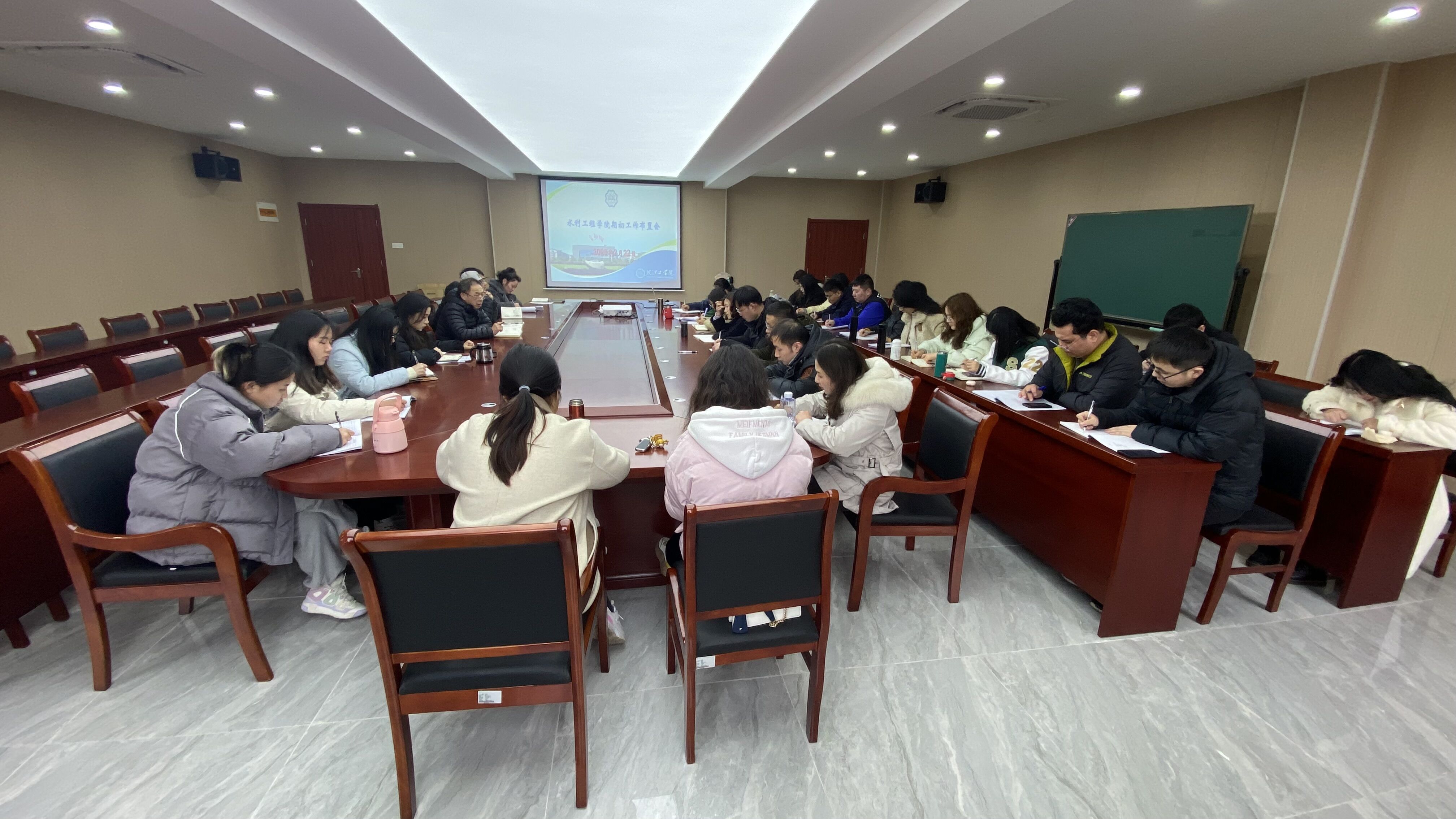 2月22日下午水利工程学院在水利土木楼西502会议室召开新学期全体教职工大会,胡明院长主持了会议。