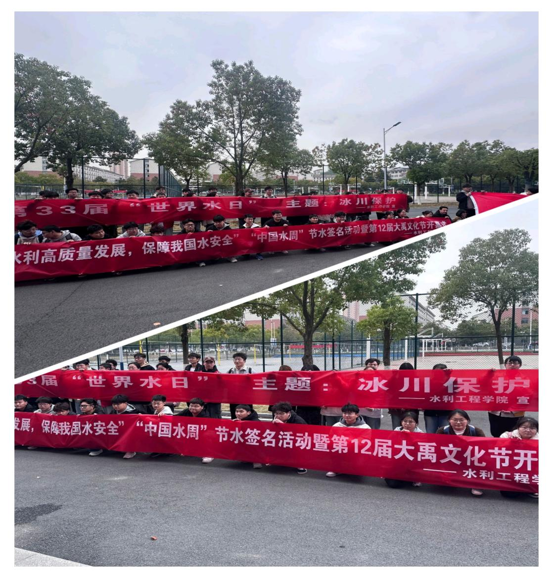 2025年3月27日,水利工程学院在新水利土木楼西门隆重举办了“中国水周、世界水日”暨第十二届“大禹文化节”开幕式主题活动,活动于中午12:00正式开始。本次活动旨在响应联合国“冰川保护”全球倡议,我国“推动水利高质量发展,保障我国水安全”的战略部署及习近平总书记“节水优先、空间均衡、系统治理、两手发力”的治水思路,唤起公众的节水意识,加强水资源保护。通过一系列丰富多彩的活动,增强师生的节水护水意识,弘扬大禹治水精神,推动校园形成珍惜水资源、保护水环境的良好风尚,营造浓厚的校园水文化氛围。