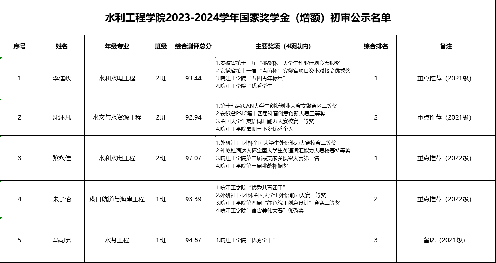 根据《财教〔2024〕181号关于调整高等教育阶段和高中阶段国家奖助学金政策的通知》、《皖工学(2024)23号关于评选2023-2024学年国家奖学金和国家励志奖学金的通知》、《皖工校政(2024)94号关于印发beat365正版唯一官方网站学生综合测评试行办法(修订)的通知》文件要求,遵循公开、公平、公正的原则,经学生本人申请、各年级专业民主评议后报学院初审、学院评审领导小组审议,分年级横向比较推优,以学生综合素质测评得分排名为主要评定依据,初审评选推荐出水利院2023-2024学年国家奖学金(增额)5名(其中4名重点推荐,1名备选),现将初审名单公示,公示期为2024年11月1日至11月7日。如有异议,请于2024年11月7日17:00前,以书面形式向学院学生工作办公室反映。