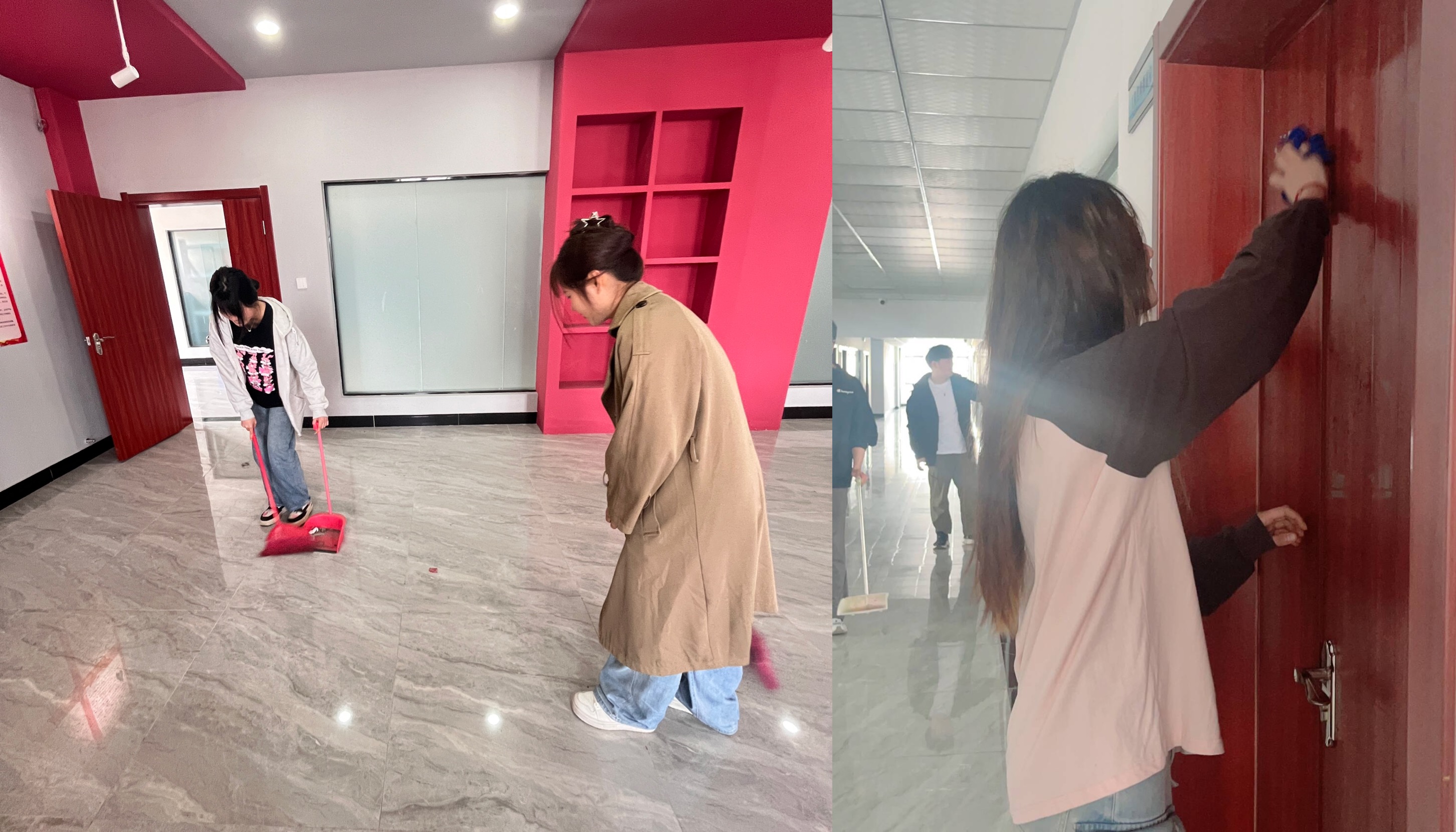 本次活动在校内进行,活动区域在水木楼。活动中,发展对象在老师的带领下,对水木楼的各个区域进行环境卫生检查。大家分工配合、积极投入,对办公室的办公桌椅、门框、地面、墙面、玻璃窗等地方进行了仔细清扫,同时,对卫生间、楼道等公共区域的卫生死角和杂物也进行了全面清理,以实际行动展现了齐心协力、不怕吃苦不怕累的志愿服务精神。