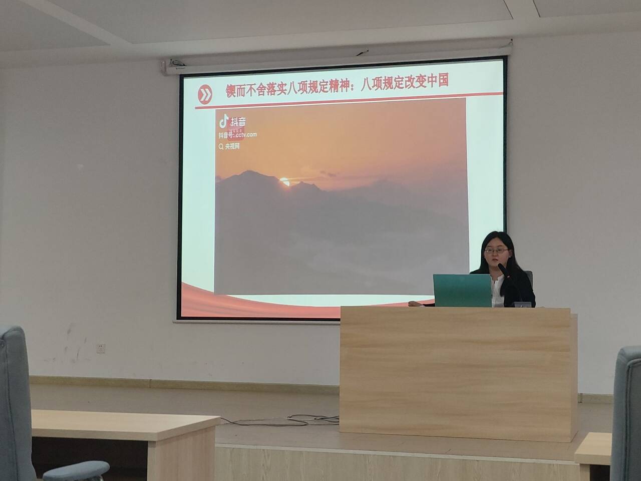 会议认真学习了习近平总书记关于深入贯彻中央八项规定精神学习教育的重要讲话精神和重要指示精神,传达学习了习近平总书记对党纪党风党性建设的重要讲话精神。支部书记王露仪以“从严从实,抓好党员队伍建设”为主题,围绕中央八项规定的背景意义、核心内涵、与中央八项规定精神之间的联系与区别、典型案例剖析以及落实措施五个方面进行专题授课。