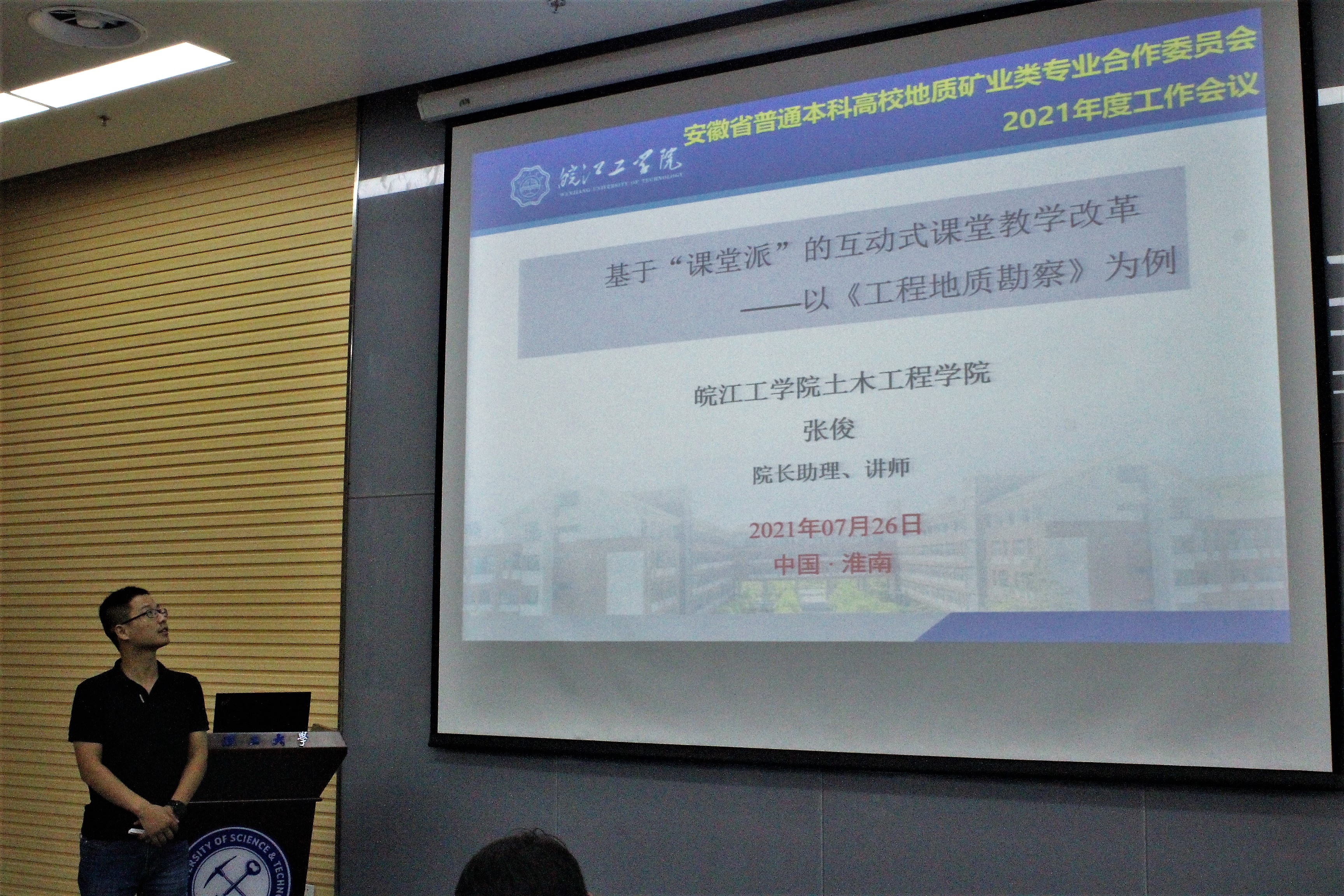 会上,专业合作委员会通报了近两年来的工作开展情况和第一轮专业评估结果,听取了安徽理工大学陈登红副教授关于“新工科背景下智能采矿工程专业人才培养方案探索——以安徽理工大学智能采矿工程为例”、鲁海峰教授关于“安徽理工大学地质工程一流专业建设思考与进展”等专家的报告,我院张俊博士应邀做了“基于‘课堂派’的互动式课堂教学改革——以《工程地质勘察》为例”的主题报告。