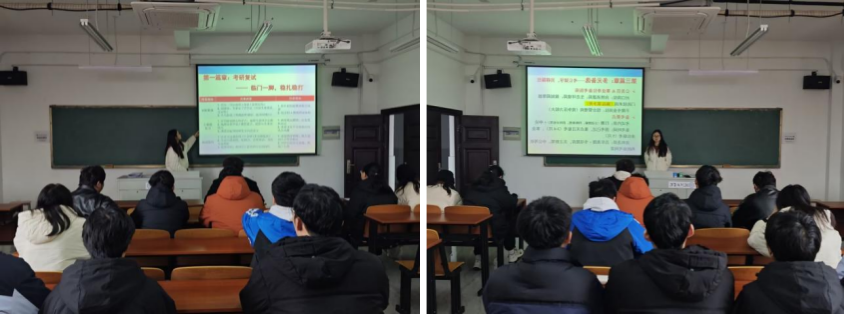 班会上,班主任侯仔依紧扣近期学子核心需求,分板块系统展开讲解:针对考研学子,重点梳理复试材料清单、复试流程要点及面试准备技巧;面向求职同学,详细解读春招时间线、简历优化方法、面试应答策略等实用内容;同时,也为有考公、留学意向的学生梳理了备考要点、申请流程等备选路径。分享过程中,侯仔依结合真实案例进行分析,针对性给出避坑提醒,让规划指导更具实用性与可操作性。