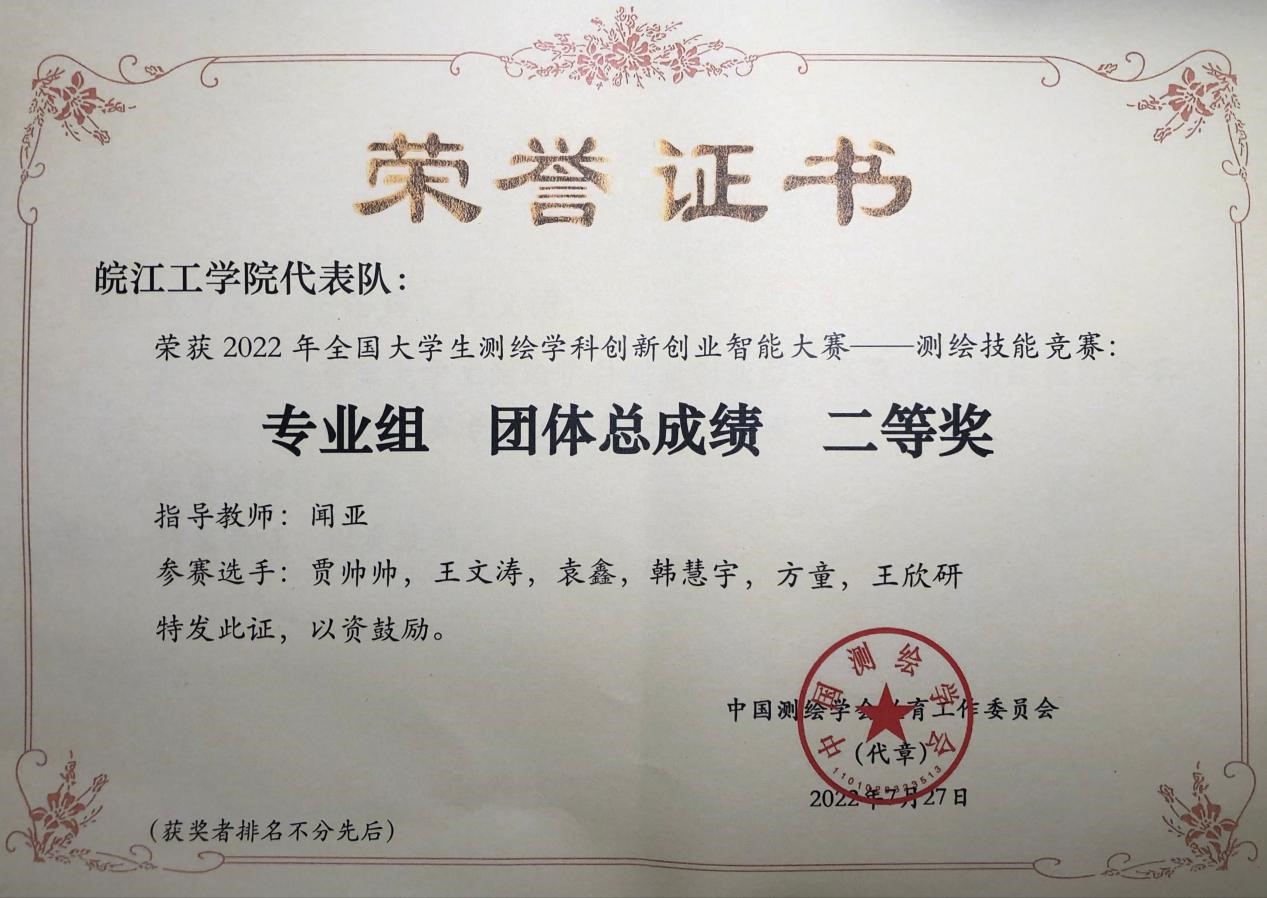 2022年全国大学生测绘学科创新创业智能大赛获奖证书已于近日发放,beat365土木工程学院闻亚老师指导的学生在测绘技能竞赛(数字测图组、无人机组、程序设计组)均斩获佳绩,首次获国家级一等奖1项,国家级二等奖2项,并获专业组团体总成绩二等奖,实现了历史性突破!