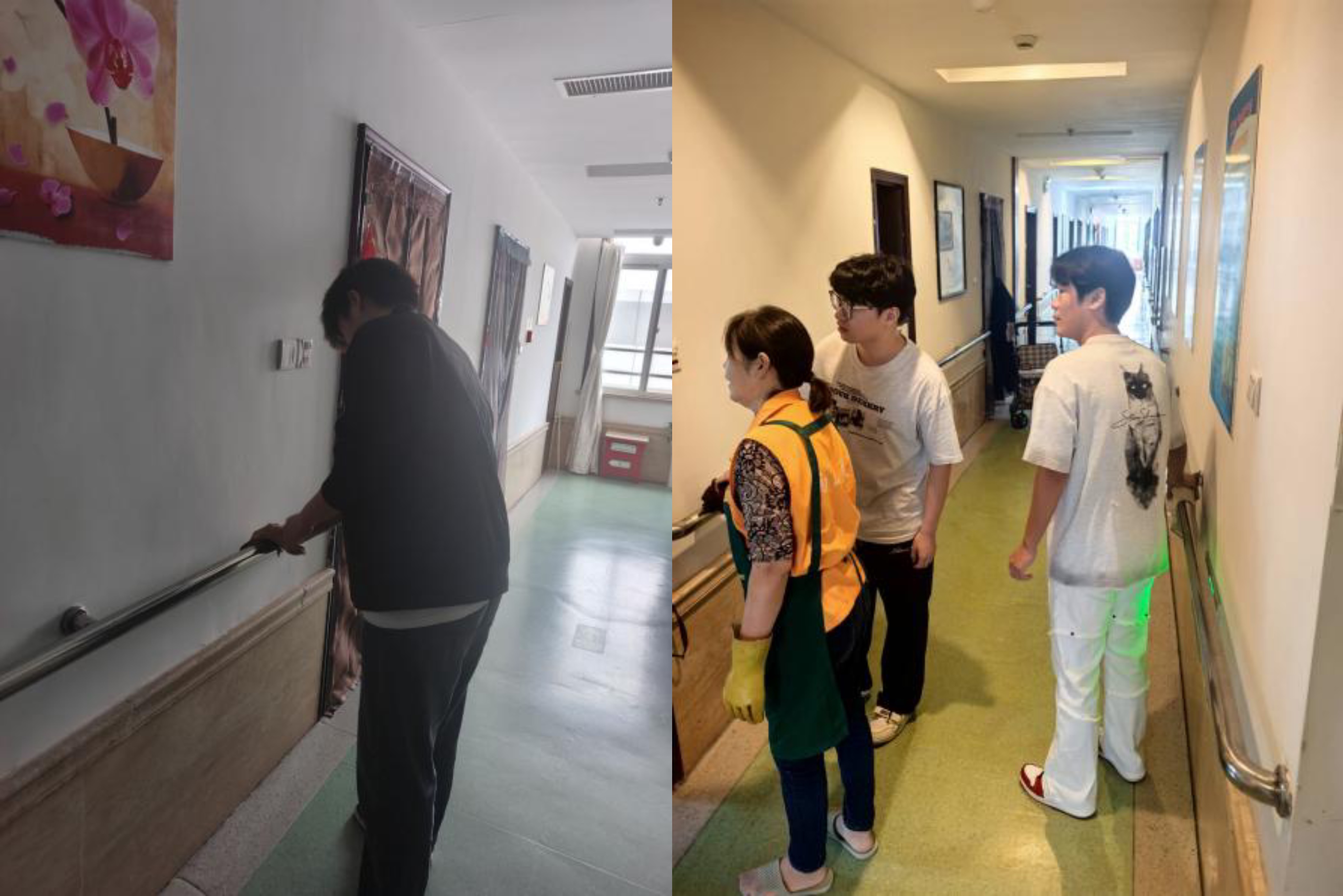 在老人们的活动时间里,团队成员们参与到老人的活动中,陪伴他们打牌、写毛笔字,场面十分热闹,房间充满了轻松愉快的交谈声和笑声。