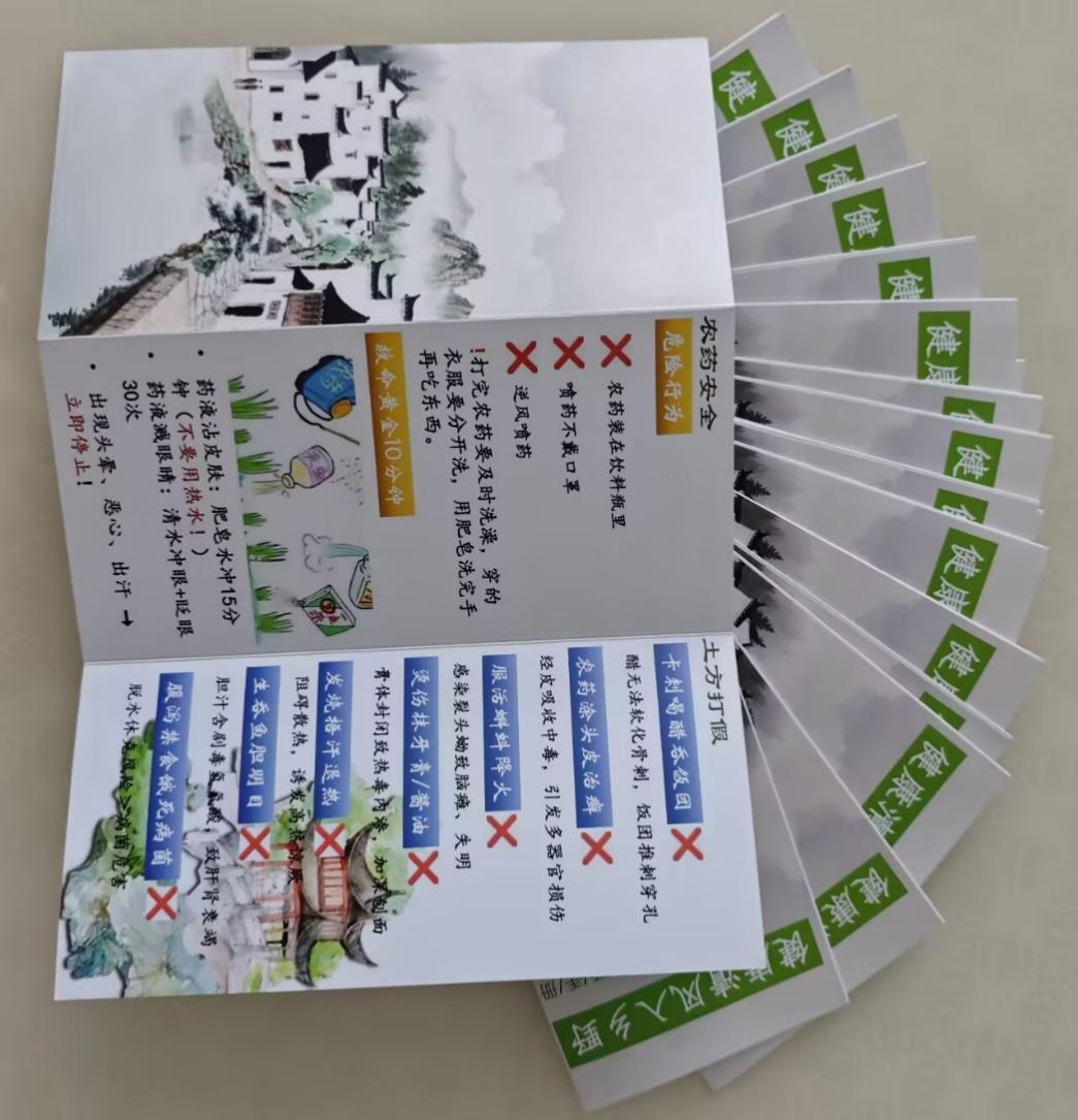 活动现场,团队成员穿梭在人群中,将精心设计、图文并茂的健康宣传册一一递到村民手中。宣传册以图文并茂的形式,用通俗易懂的语言讲解各类实用健康知识:在慢性病防治板块,着重介绍高血压、糖尿病的早期症状、饮食禁忌和运动建议,提醒村民“控盐少糖、定期测血压”;食品安全方面结合农村生活场景,列举了剩菜储存、生熟分开等细节,还标注“发芽土豆不能吃”“腌菜少吃更健康”等关键提示;农药安全方面清晰罗列“配药戴防护、用完清器具、救命黄金十分钟”等要点;土方打假方面则逐一揭穿“烫伤涂酱油”“发烧捂汗”等常见误区,并列出科学依据的方法,帮助村民树立正确的健康认知。