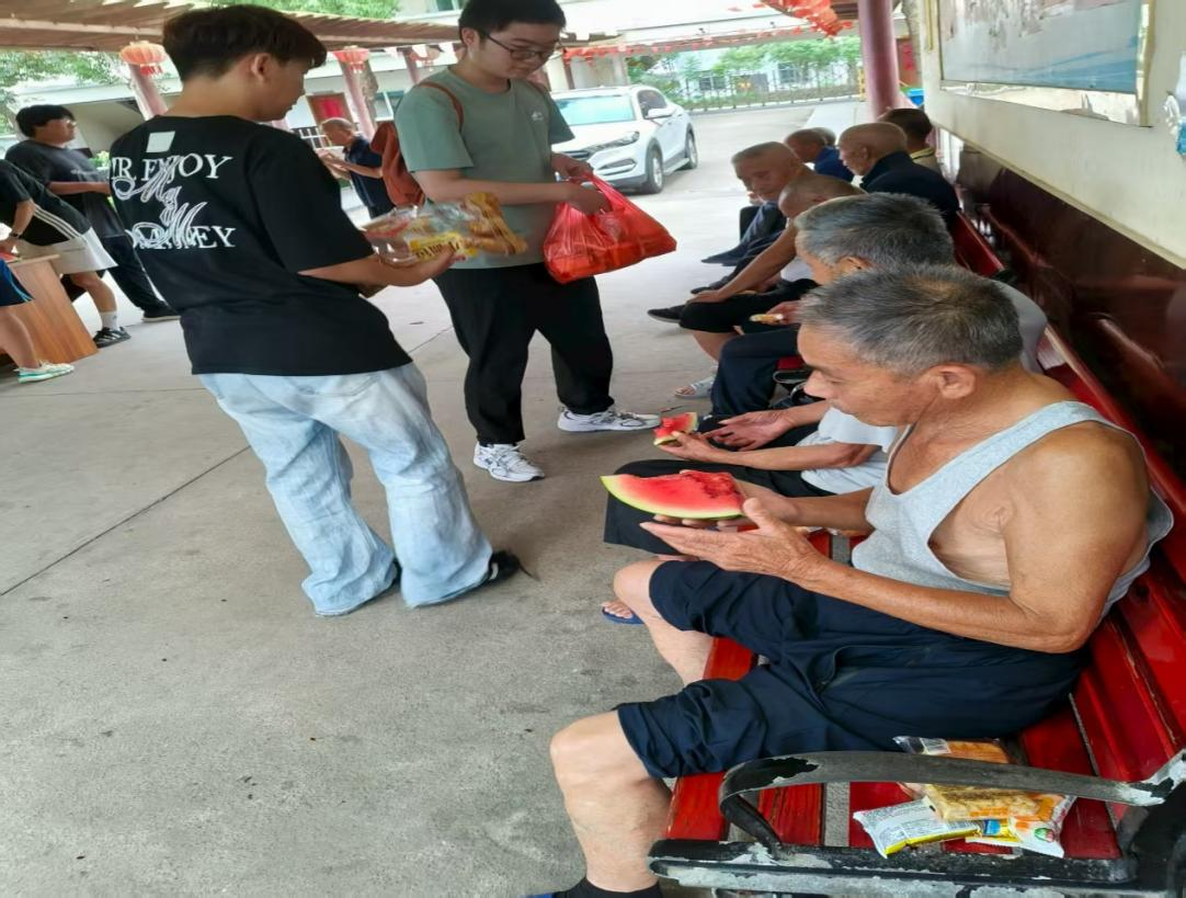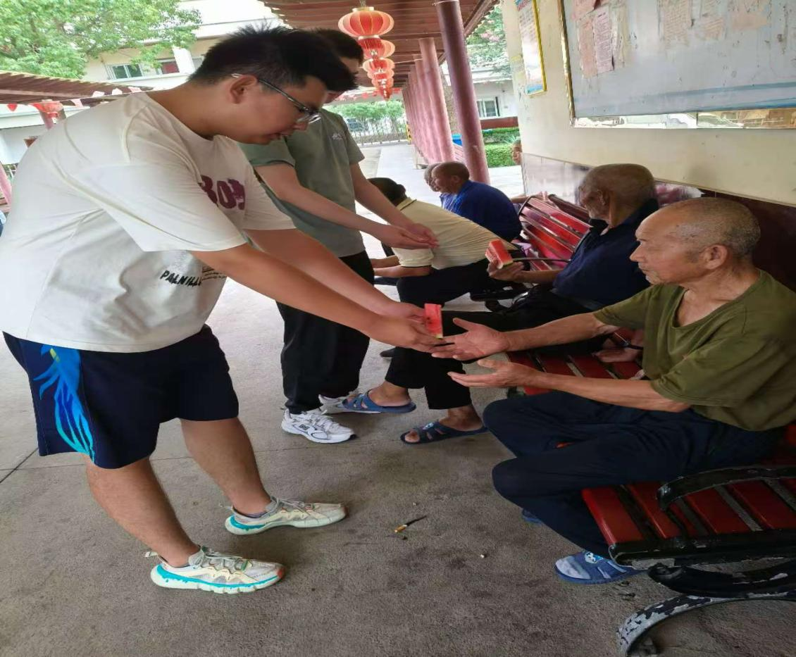 抵达桃溪镇敬老院后,实践团队的大学生成员们始终遵循老人意愿,整个活动以不打扰老人正常生活为前提,有序开展帮扶活动。大学生志愿者携带提前筹备的西瓜,面包和零食进行慰问品的发放。在志愿者分发西瓜以及面包零食的过程中,大学生们放慢节奏、耐心细致,将切好的西瓜递送到每一位老人手中,为每位老人带来属于大学生志愿者的温暖。