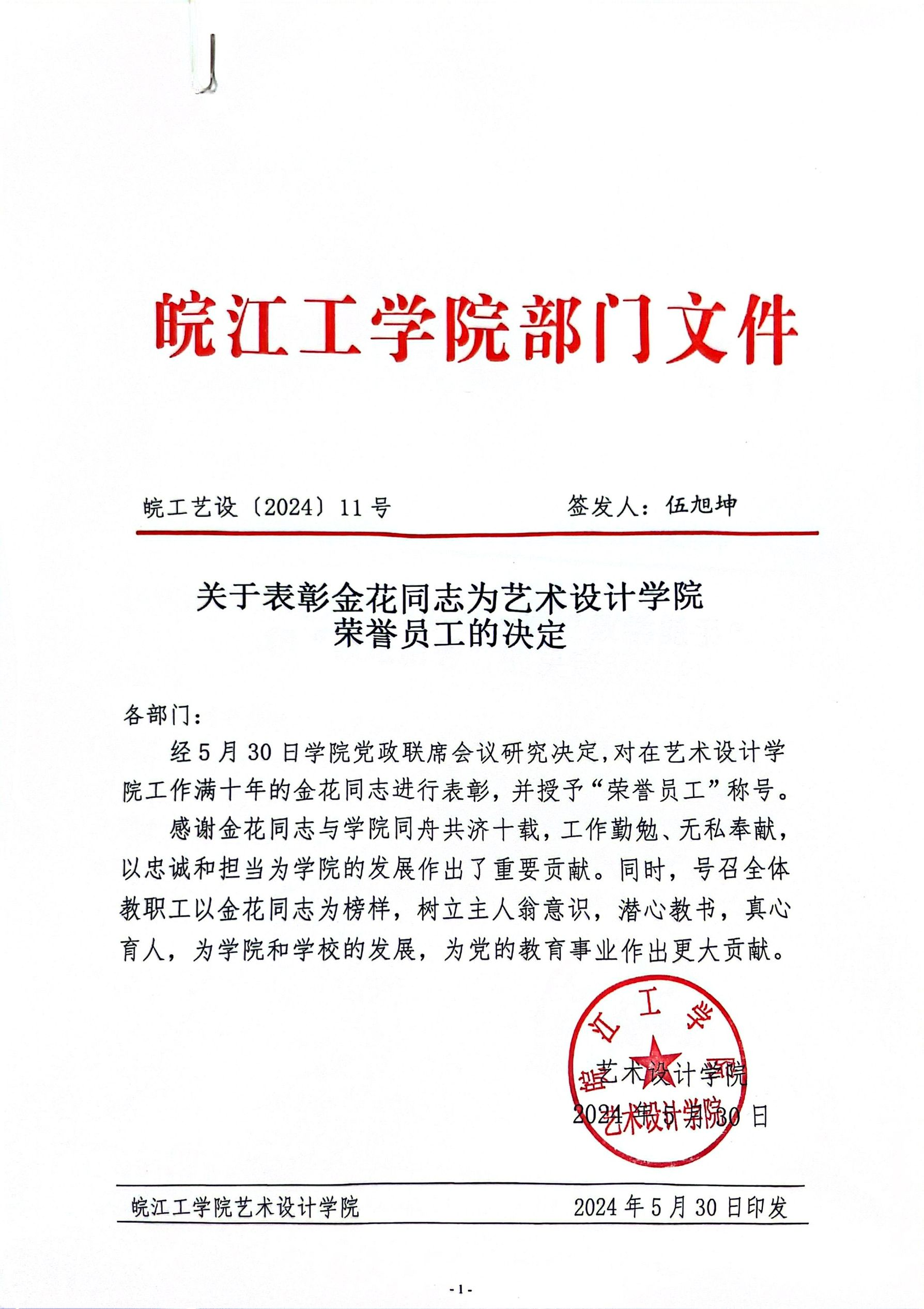 关于表彰金花同志为艺术设计学院荣誉员工的决定