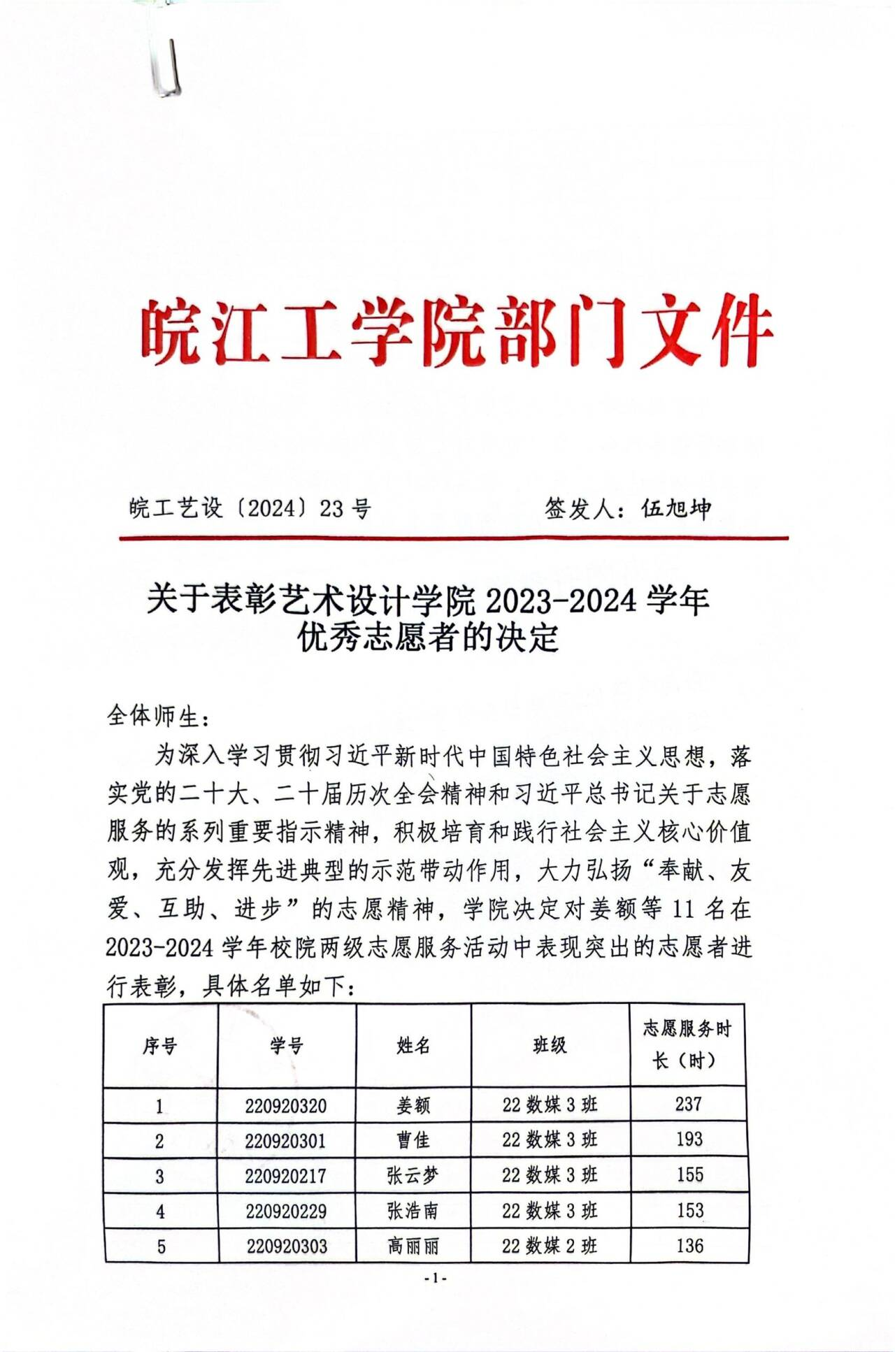 关于艺术设计学2023-2024学年优秀志愿者的决定