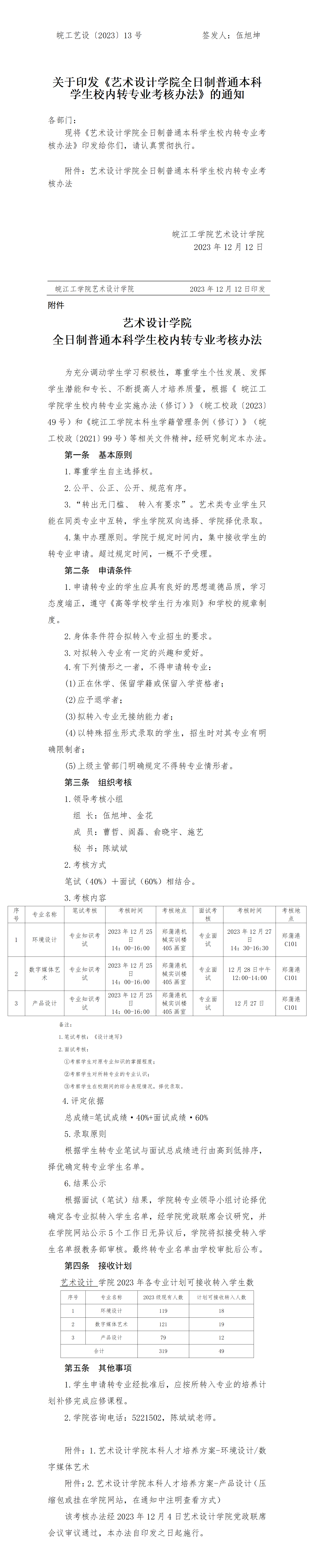 关于印发《艺术设计学院全日制普通本科 学生校内转专业考核办法》的通知