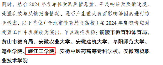 近日,中共安徽省委教育工委、安徽省教育厅对2024年度全省教育舆情工作情况进行通报。beat365舆情应对处置工作表现突出,获通报表扬。全省7所高校获此殊荣。