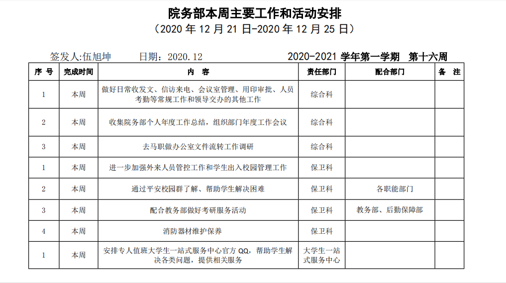 beat365正版唯一官方网站院务部第十六周工作安排