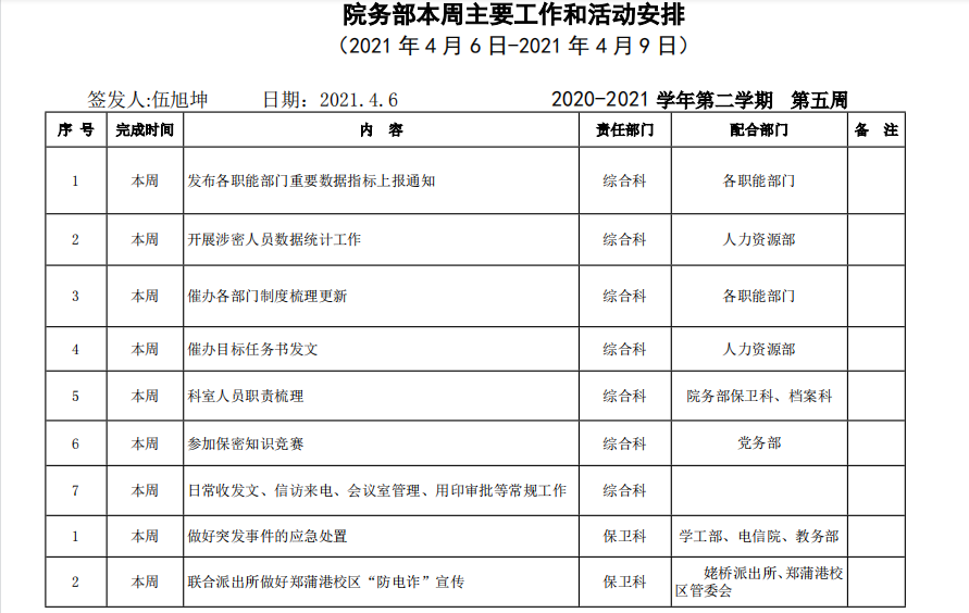 beat365正版唯一官方网站院务部第六周工作安排