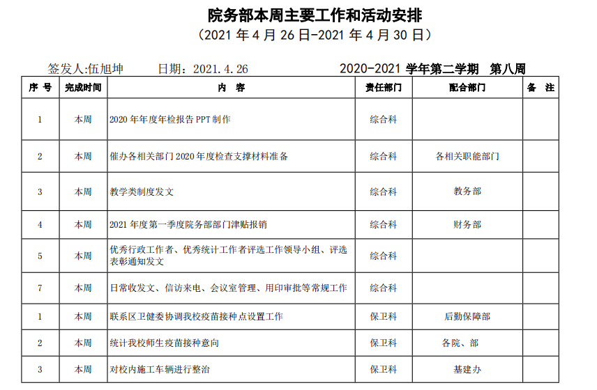 beat365正版唯一官方网站院务部第八周工作安排
