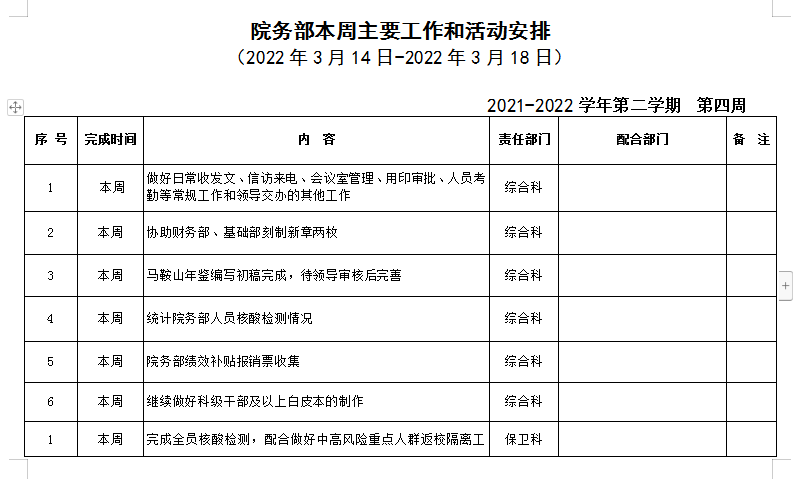 beat365正版唯一官方网站院务部第四周工作安排