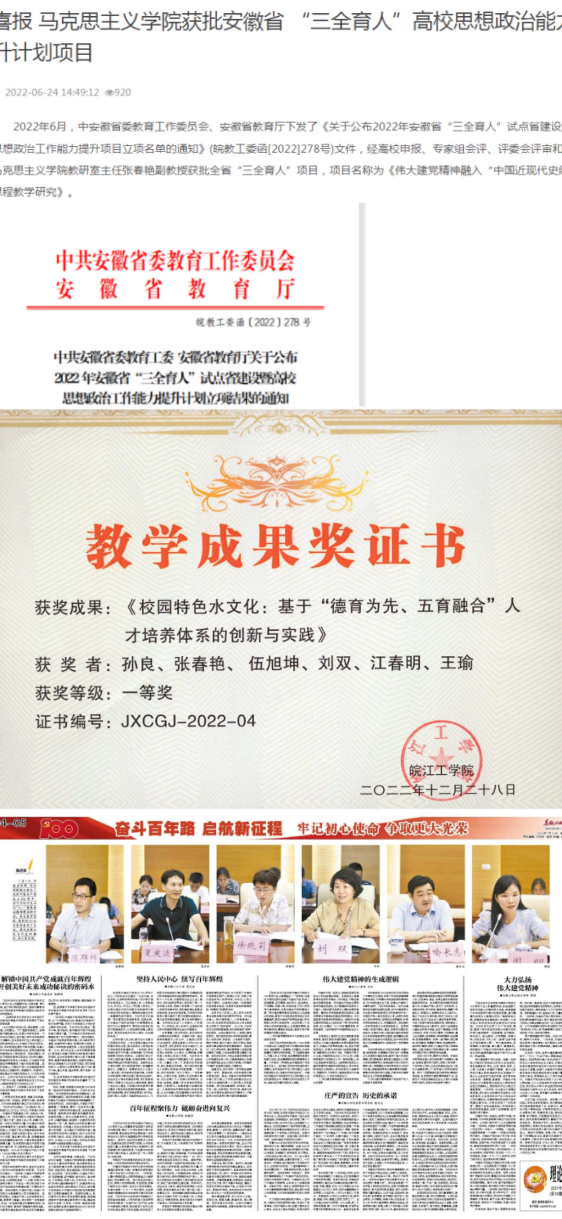 建校以来,学院教师获得安徽省优秀教师1名,安徽省思政课教学大赛一等奖1名,二等奖3名,三等奖3名。安徽省教学创新大赛三等奖1名,长三角教学竞赛三等奖1名,获批安徽省优秀党员2名。获得安徽省教学成果奖二等奖2项,三等奖2项。校级教学成果奖二等奖2项,安徽省思政课示范金课入围奖1项。
