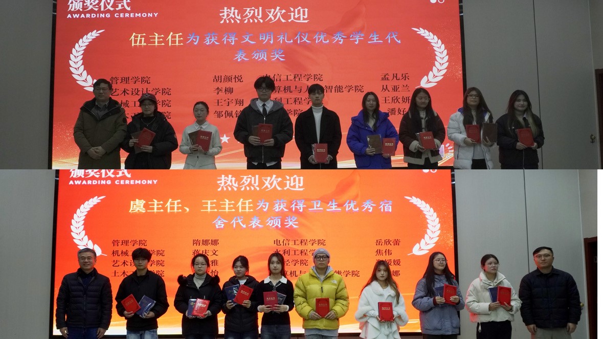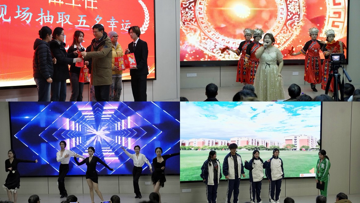 元旦晚会中场设置颁奖环节,首先伍旭坤为获得文明礼仪优秀学生代表颁奖,并抽取了五名幸运观众送上元旦大礼包;随后虞忠华、王思奇为优秀寝室颁奖,并抽取了十名幸运观众送上元旦大礼包。掀起了全场热潮。拉丁舞《Low》活力登场,灵动舞姿搭配动感音乐,尽显异域风情。《爱错》融合合唱与小提琴,悠扬乐声与深情演唱相得益彰。小品《记一次难忘的运动会》延续欢乐氛围,演员们用诙谐表演再现运动会趣事,勾起全场师生共同回忆。7人合作的《大地飞歌》将合唱与舞蹈结合,欢快节奏传递出喜悦之情。独唱《爱如潮水》触动观众心弦,温柔歌声里满是深情。葫芦丝表演《相逢是首歌》旋律悠扬,尽显民族乐器魅力。最后,22人带来大合唱《夜空中最亮的星》,熟悉的旋律响起,全场师生共同跟唱,将对未来的期许融入歌声里,而穿插其中的抽奖环节更是将现场的欢乐与期待值拉满,晚会全程高潮迭起、精彩纷呈,掌声与喝彩声经久不息。