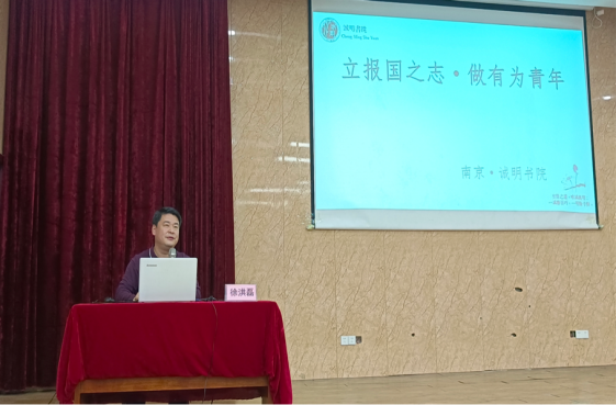 讲座开始前,李咏东老师和学生代表分别深情地朗诵了《我爱这土地》、《祖国啊,我亲爱的祖国》诗歌,在两首深表爱国情怀的诗朗诵之后,南京诚明书院徐洪磊院长以“立报国之志•做有为青年”为主题正式开始了本次讲座。徐洪磊以影视剧《觉醒年代》中的陈乔年、陈延年两位先烈为例,讲述了革命者的爱国情怀,前辈如此,吾辈何已异?在场师生无不动然。随后,徐洪磊讲述了戍边英雄陈祥榕的生动事迹,“清澈的爱,只为中国”,陈祥榕用青春和生命诠释了对祖国、对人民的爱。最后,徐洪磊给大家讲述了南京大屠杀历史,要求大家不忘国耻,牢记历史,以史为鉴,时刻保持忧患意识,现场下掌声雷动。